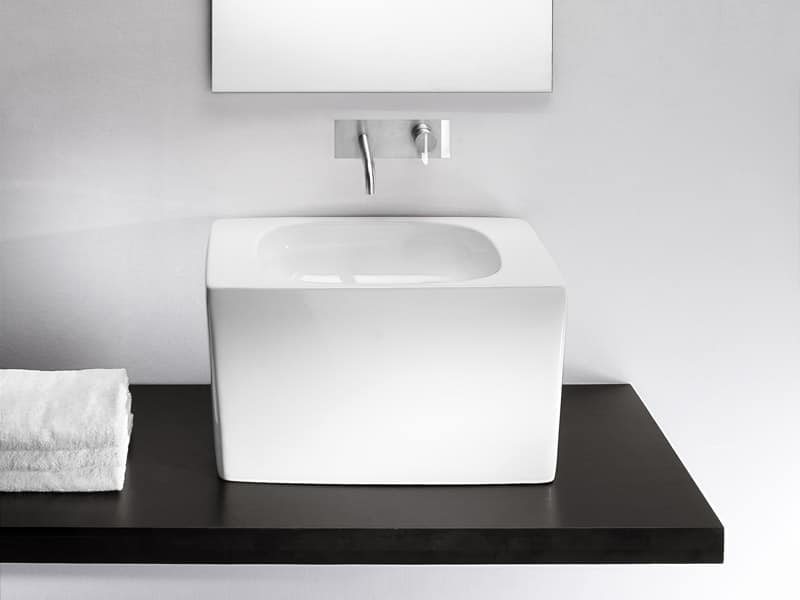 The countertop version of Tower model, as all the Tower washbasins, allow the installation of tap both on the wall or directly on the washbasin.