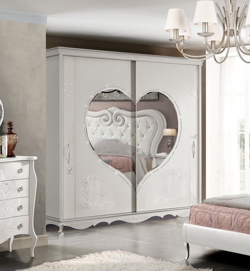 Wardrobe with 2 sliding doors, matt white lacquered, hand-decorated, with heart-shaped mirrors. Silver details and decorations on the base and hat. Swarovski inserts on the decorations. Swarosky chain around the heart mirrors.