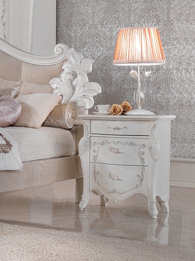 Classic style bedside table, in lacquered wood with handcrafted decorations. Equipped with 3 drawers.
