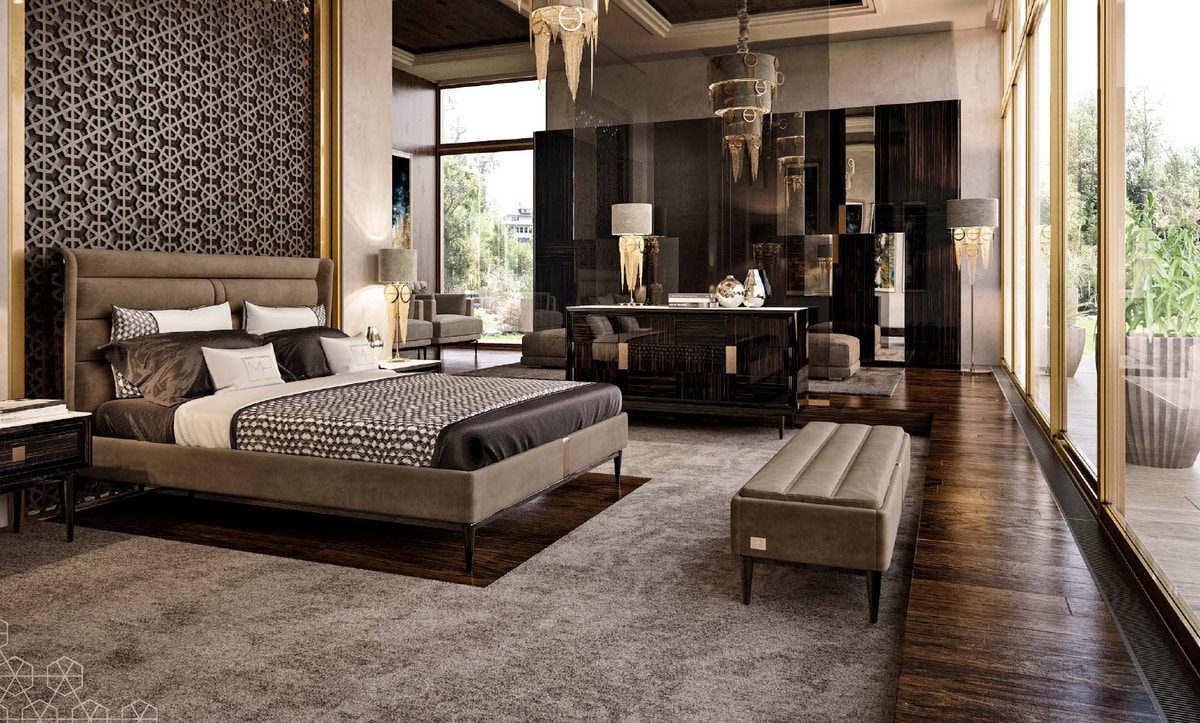 The contemporary luxury of the Miracle collection: padded and upholstered beds in nabuk, ebony or in clear lacquered surfaces, with handles and inserts in bronzed brass that give brightness and prestige to the sleeping area.