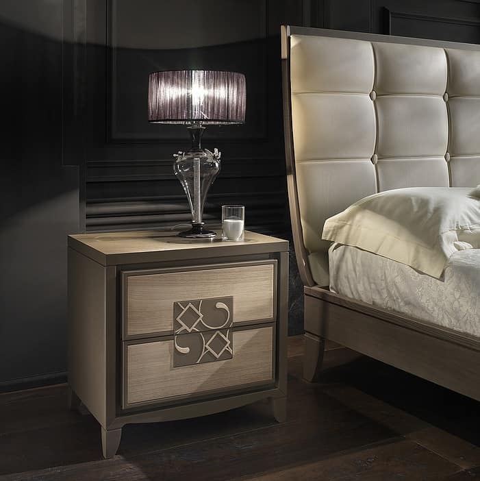 The chest of drawers and bedside tables of the street collection are made entirely of ash in relief walnut decorations. The central decoration can be embroidered leather with silver thread. Opening the drawers is push and pull.