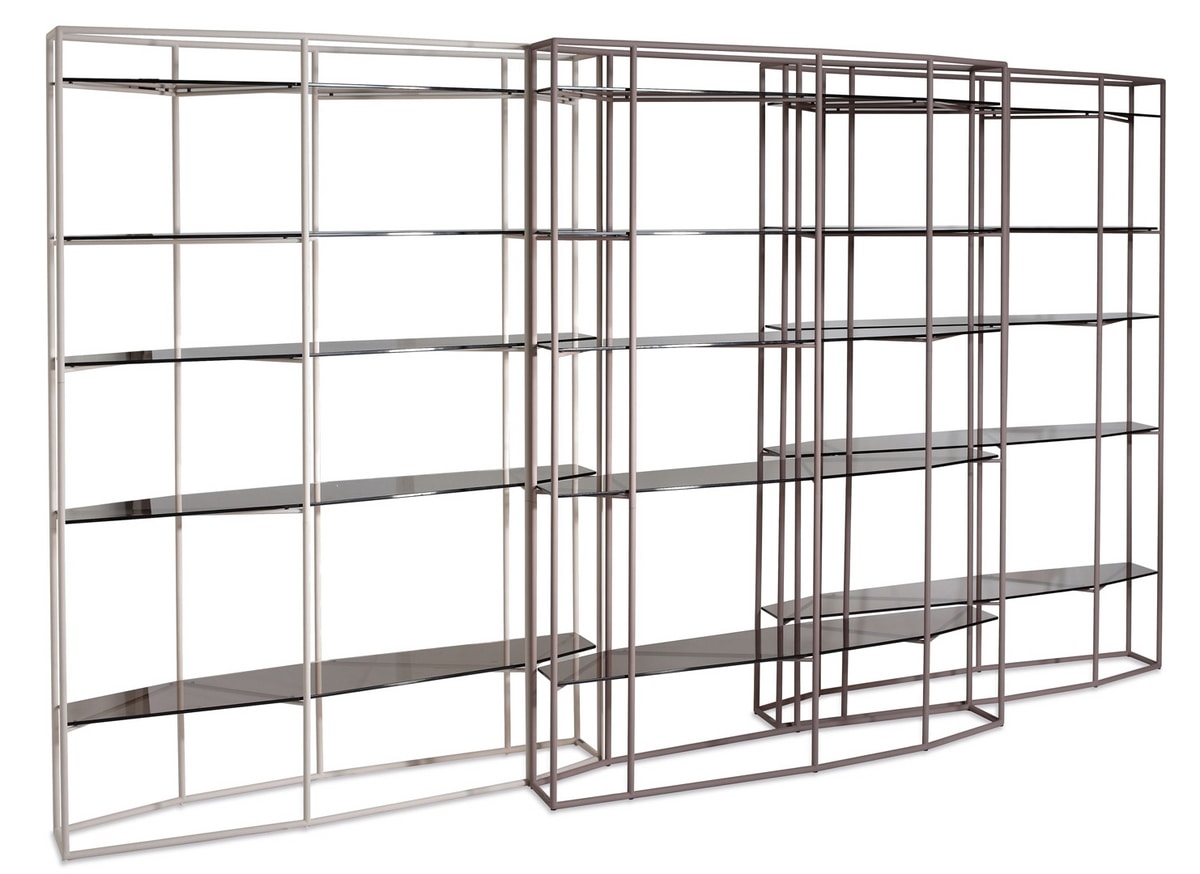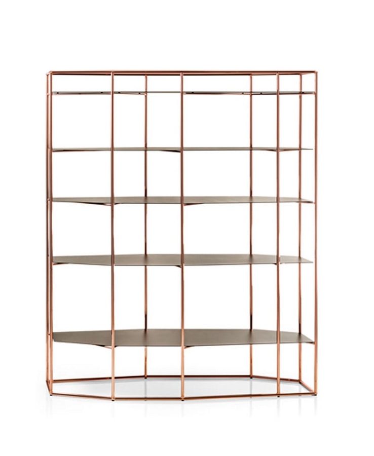 Diadema, a self-supporting bookcase system characterized by an asymmetrical design. Diadema has a built-in iron structure with thin three-millimetres shelves. The Diadema bookcase is available in different heights that allow it to furnish a whole wall, up to the ceiling. It is also perfect in the center of a room, to divide spaces. Its peculiar asymmetry allows to combine several bookcases together, creating a coherent spatial continuum.