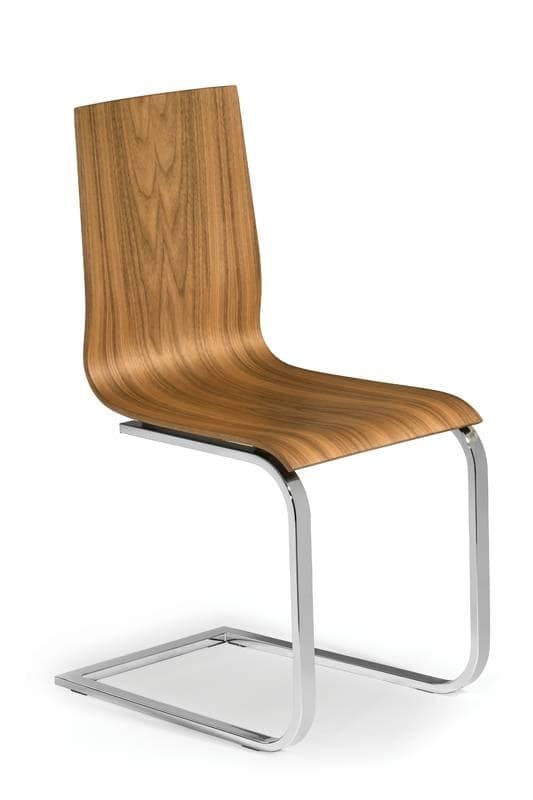 Chair with chromed steel sled and padded or wood shall, coating and wood finishing on request.