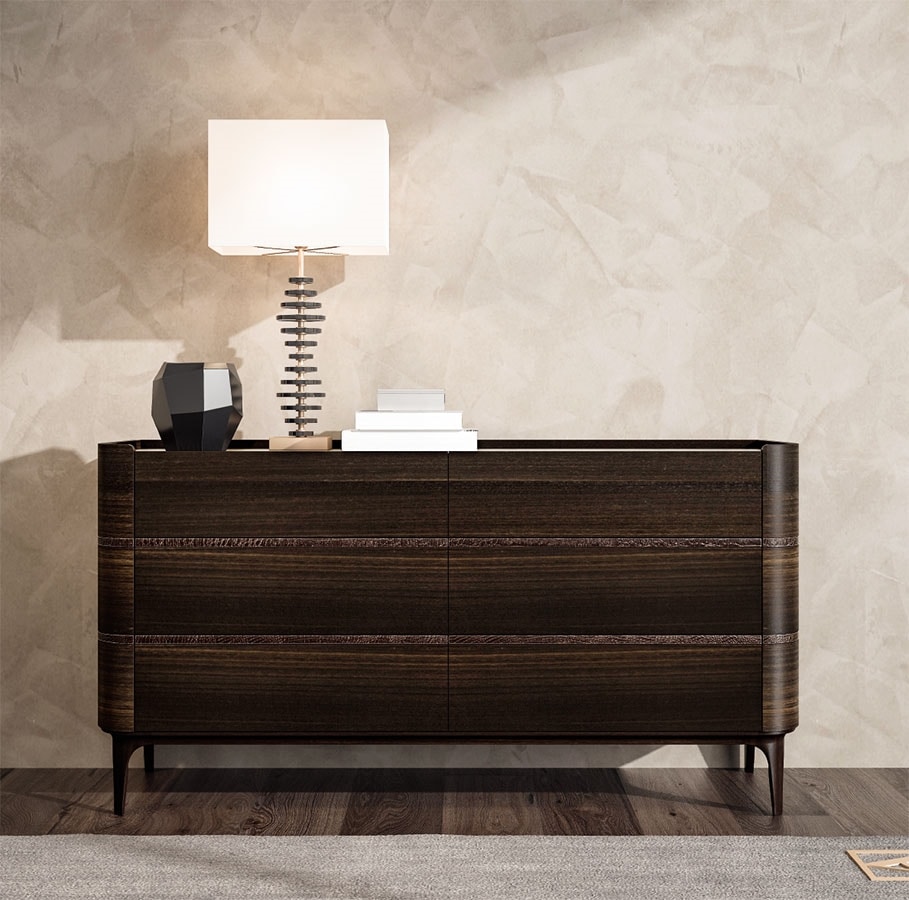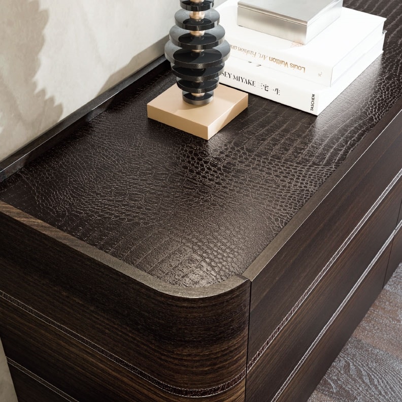 Drawers: veneered wood or lacquered with leather or fabric details. Internal lacquered wood and coated in microfiber, opening with a push-pull system.