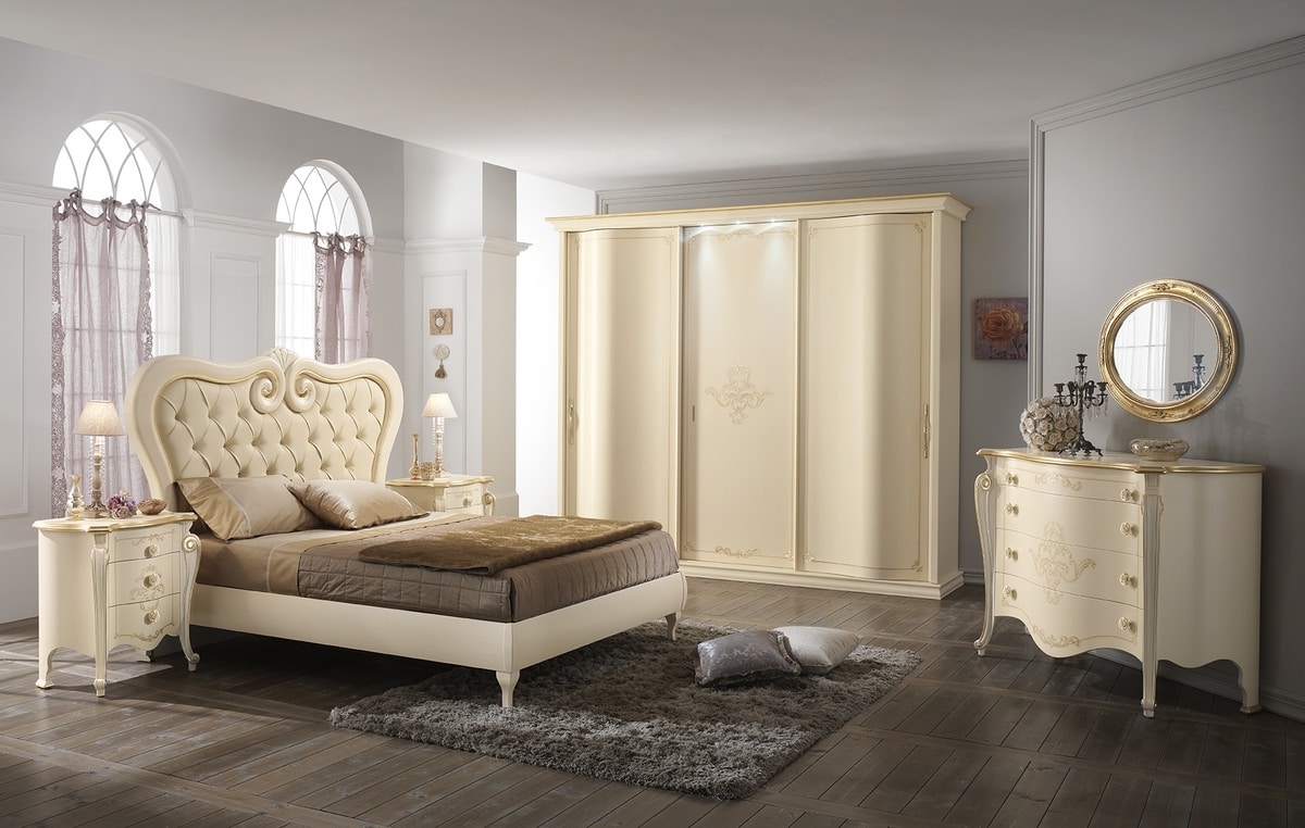 Chanel model wardrobe, 3 sliding doors, patinated and decorated by hand. Central straight and decorated door. Convex sides. Led lights on hat.