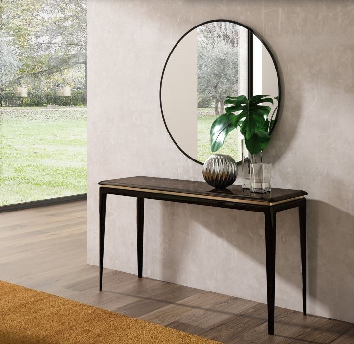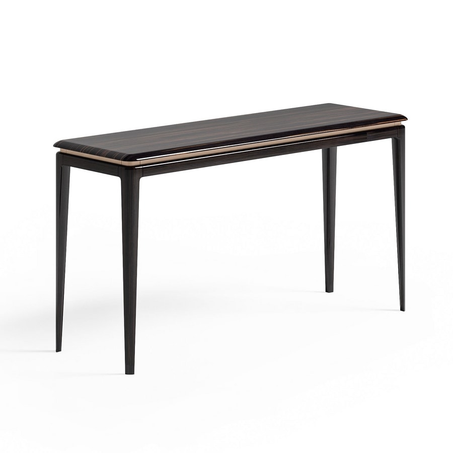 Top: shaped wood, brushed lacquered lacquered or ebony veneer, gray eucalyptus, rosewood dark with brushed glossy finish. Metal details glossy brass finish, Gold Rose or Champagne Gold, it is also possible in marble.
