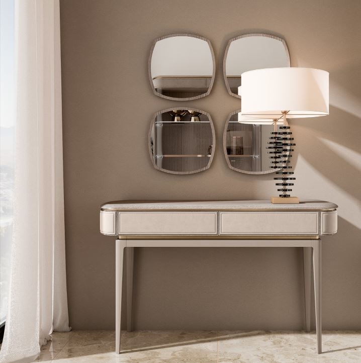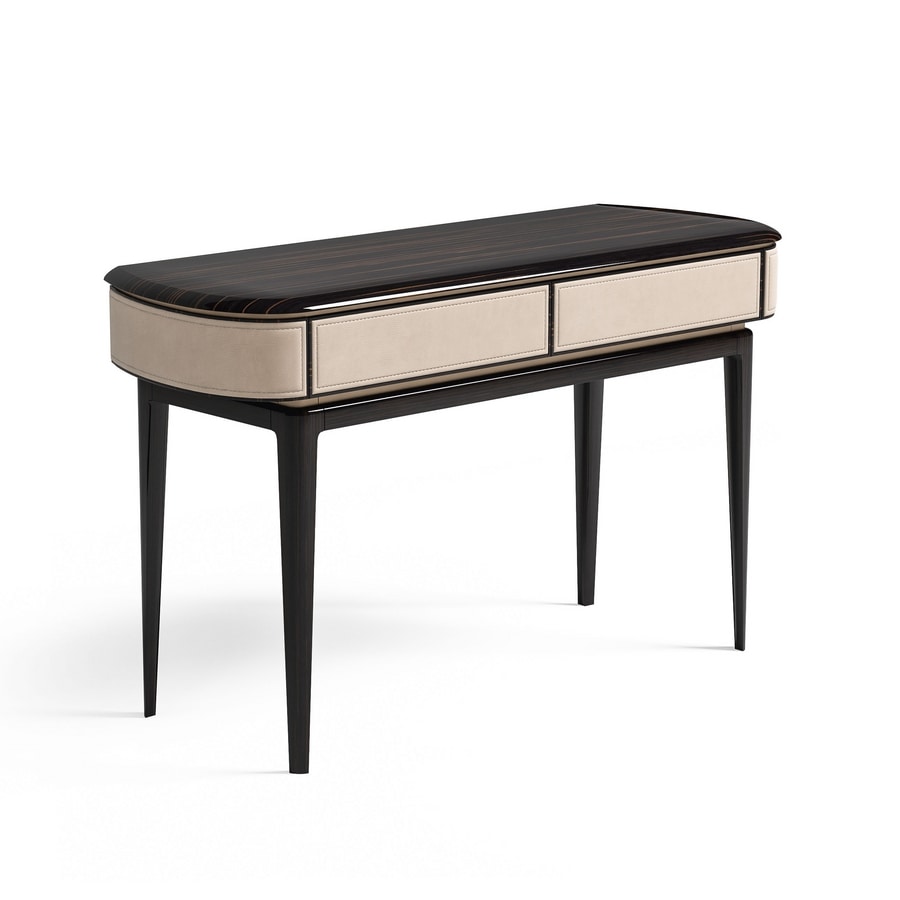 Drawers: wood with fronts covered in leather or fabric. Internal lacquered wood and coated in microfiber, opening with a push-pull system.