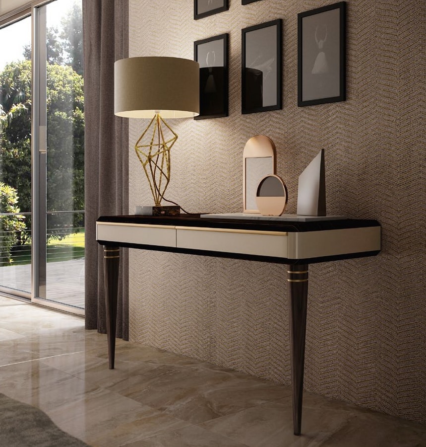 Wooden console, with two turned legs. Fronts in lacquered wood. Equipped with two drawers.