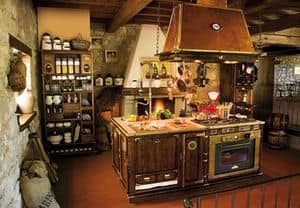 Wooden kitchen fitted, old-fashioned, copper hood