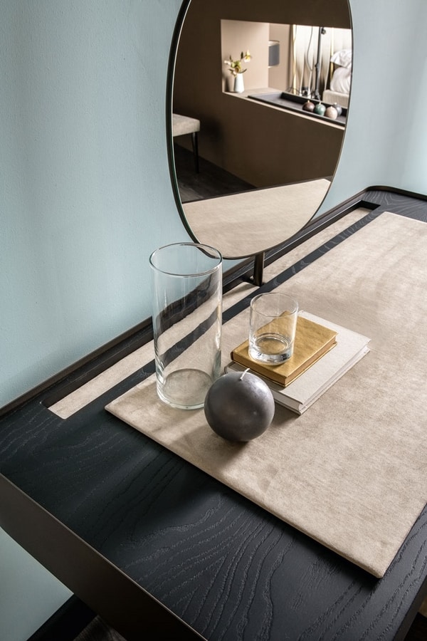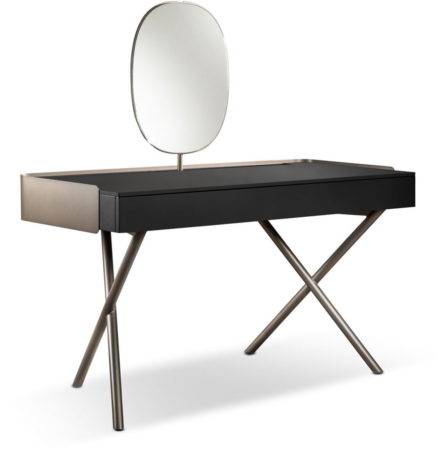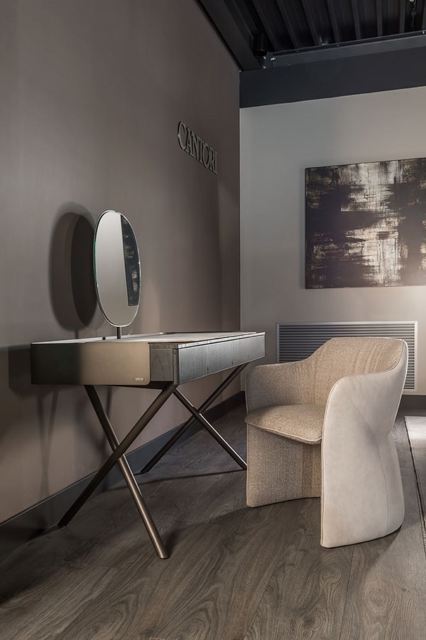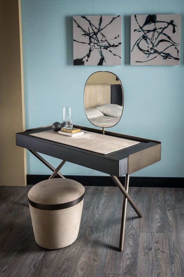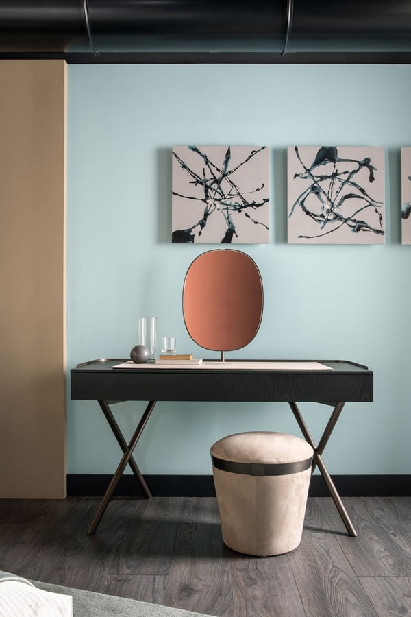 Its functional design emphasizes its elegant harmony. The soft but distinct lines are enhanced by the union of wood and metal. Luis has a round-section iron structure, its stems overlapping and forming two Xs, connected to the wooden container by means a metal support. The top is made of wood, with a single drawer, framed by the metal band that wraps around it on three sides. A storage compartment has been obtained on the top. As an accessory it is possible to add a mat covered in econabuk or leather, both for the top and the inside of the compartment. The dressing table is equipped with an ellipsoidal mirror, with a metal support of the same finish.