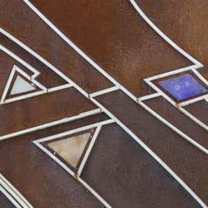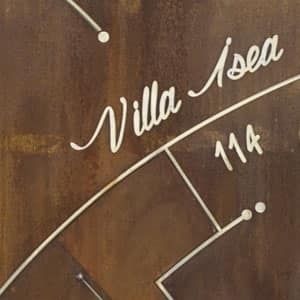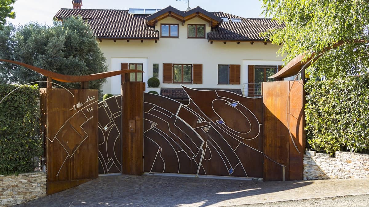 Driveway gate and pedestrian door, made of shaped stainless steel frame, with tamponade in Corten steel with inserts in fused glass, shaped shelters made of corten steel, pillars and side walls entirely covered with corten steel, all on the artist Elio design Garis.