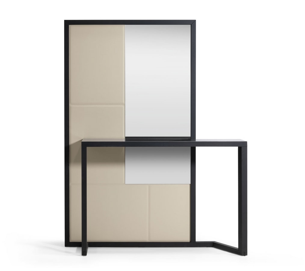 The same structure frames a wall panel with mirror and hand-stitched leather. A piece of furniture with an original design that demonstrates the great skill of Cantori's craftsmen.