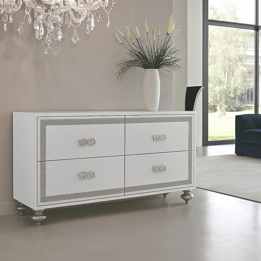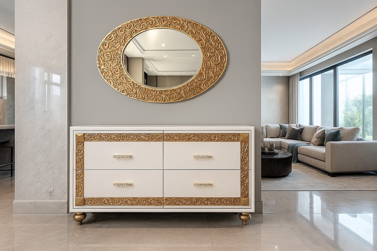 Request quote/price Similar productsThe Sideboard art. 544 is a contemporary furnishing piece that combines elegance with functionality. Its pearl white finish is enriched by decorative inlays and carvings, available in multiple options: gold, silver, silver leaf, and oxidized silver, offering versatile and refined aesthetic solutions. Built with a blockboard wood structure and plywood drawers, the sideboard ensures solidity and long-lasting durability. The drawers are equipped with soft-close guides, providing maximum comfort in everyday use. Fully customizable in colors, finishes, and decorative details, the sideboard art. 544 is perfect for modern living rooms, reception areas, and interiors that require an exclusive touch of style.