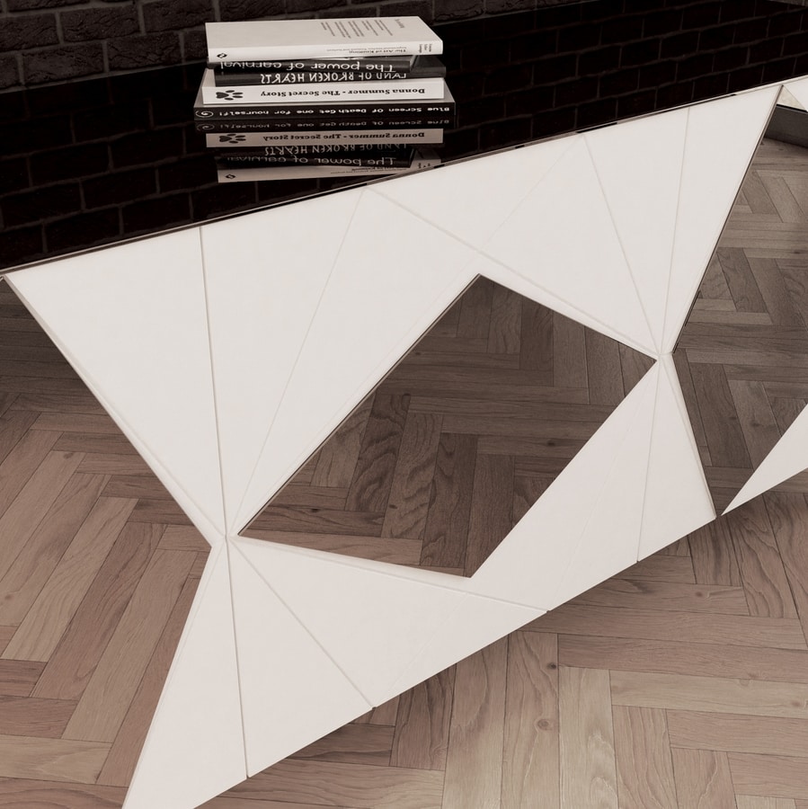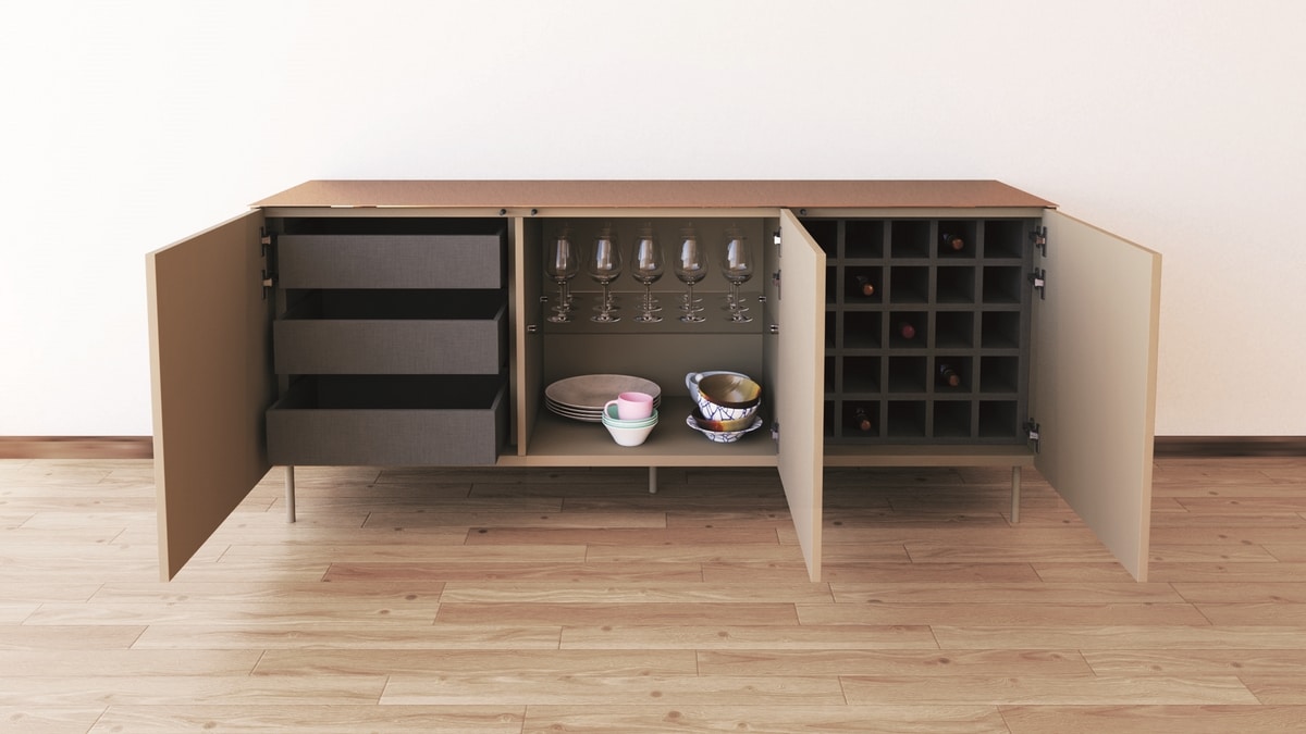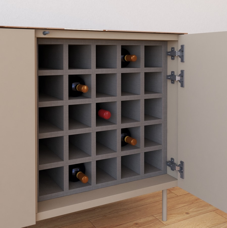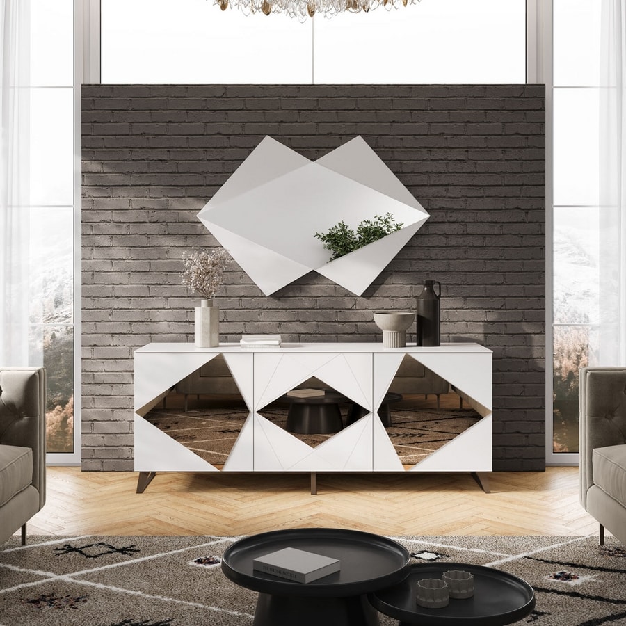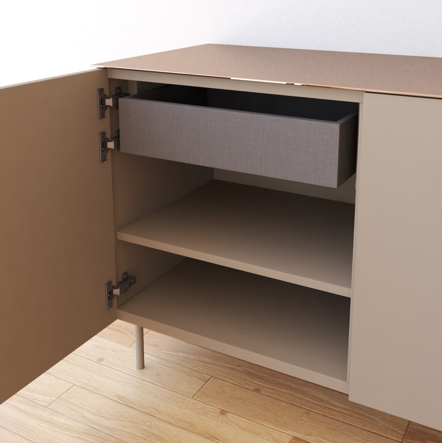 Essential geometries, lacquered surfaces, and glass converge in the Ipno sideboard, in a dialogue of transparencies and reflections. Lacquered doors with glass inserts and coordinated side panels meet the mirrored top, enhancing both continuity and lift. Painted metal supports complete the composition with discretion, while reflective surfaces play with light, shifting from neutral tones to deeper hues.