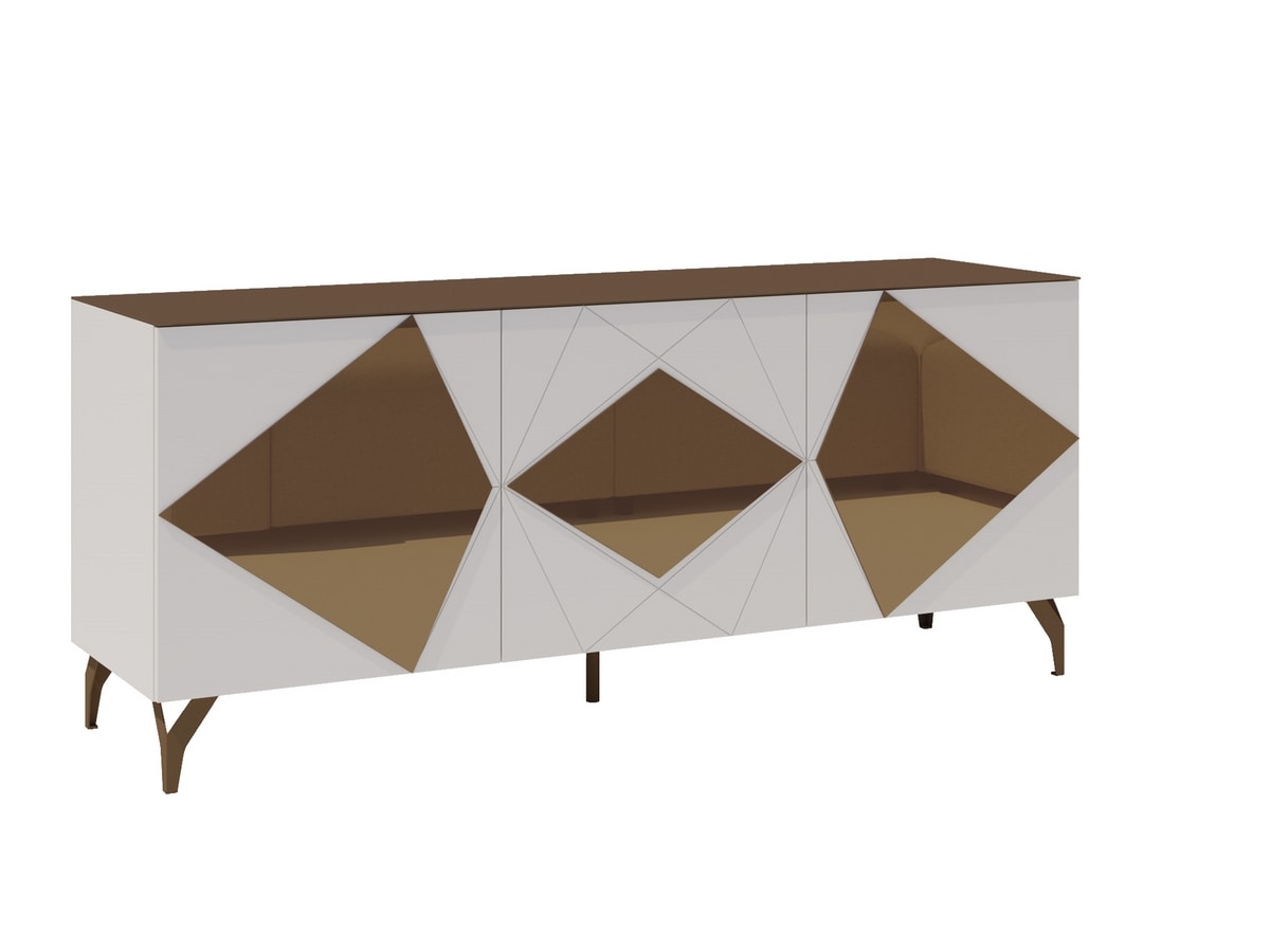 3-Door Sideboard. Matte white lacquered sides and doors. Bronzed mirror panels. Bronze-painted metal flat bar legs. Bronzed mirror top.