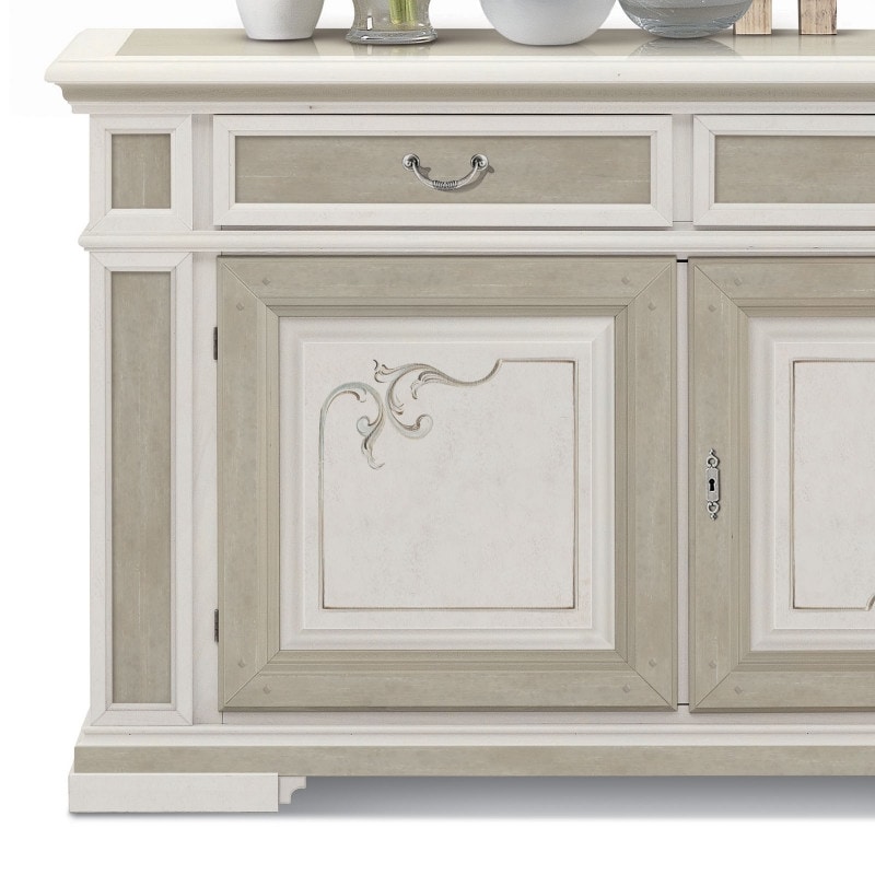 Request quote/price Similar productsShabby Chic sideboard with two doors and two drawers, perfect for adding a touch of elegance to your dining room, living room, lounge or kitchen. Handmade in Italy with great attention to detail. Colored and decorated by hand with a brush, it has 2 ashlar doors with lock and internal shelf and 2 undercounter drawers. Shaped wooden profiles around furniture sides, doors and drawer fronts. Its open ground plinth makes it even more elegant, but also robust and solid. This Shabby Chic sideboard is ideal for those looking for a piece of furniture with a unique and high quality aesthetic.