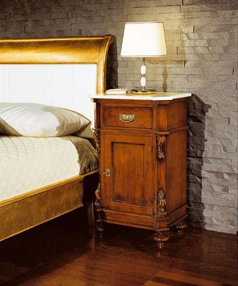 Bedside table made of solid walnut, 800 style reproduction. Marble top. The interior of the drawers has a dovetail finish.