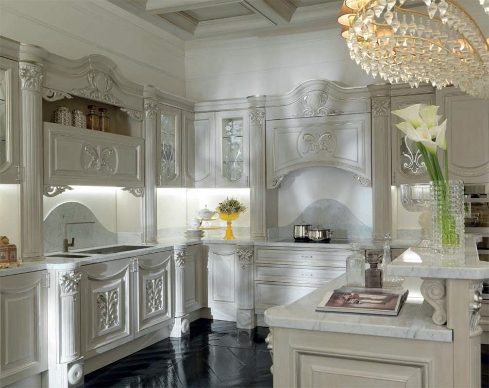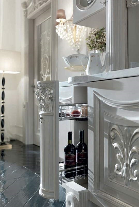 Classic kitchen, with Polvere di Stelle finish. Carvings and craftsmanship. Wine cellar and appliances with maximum functionality. Top in marble.