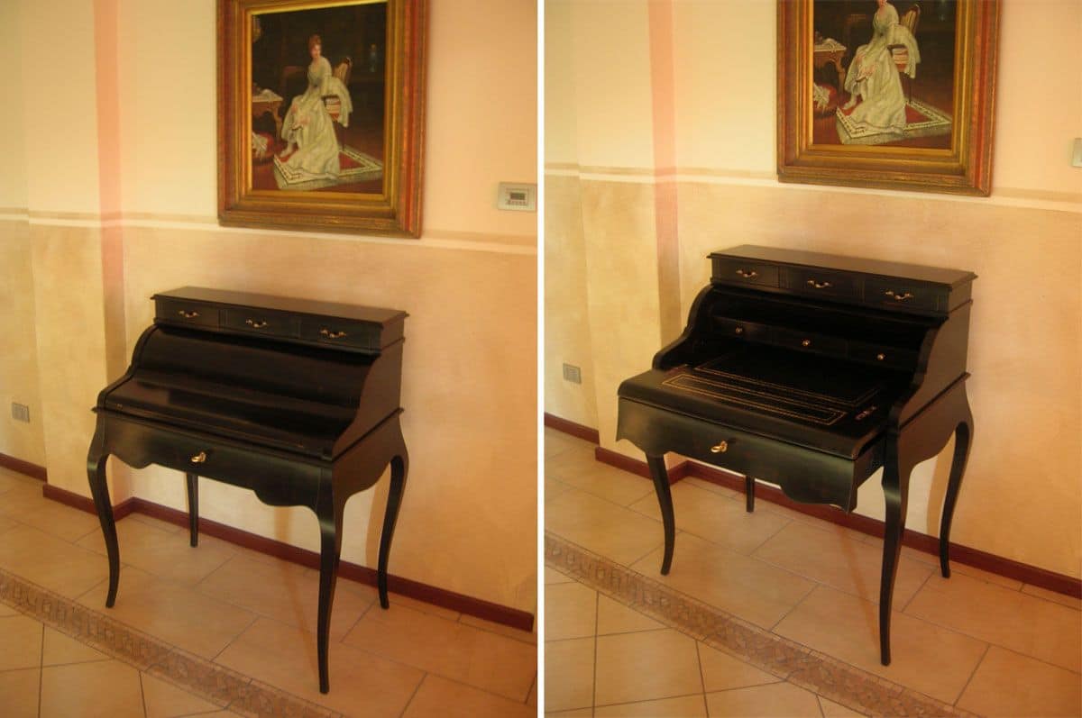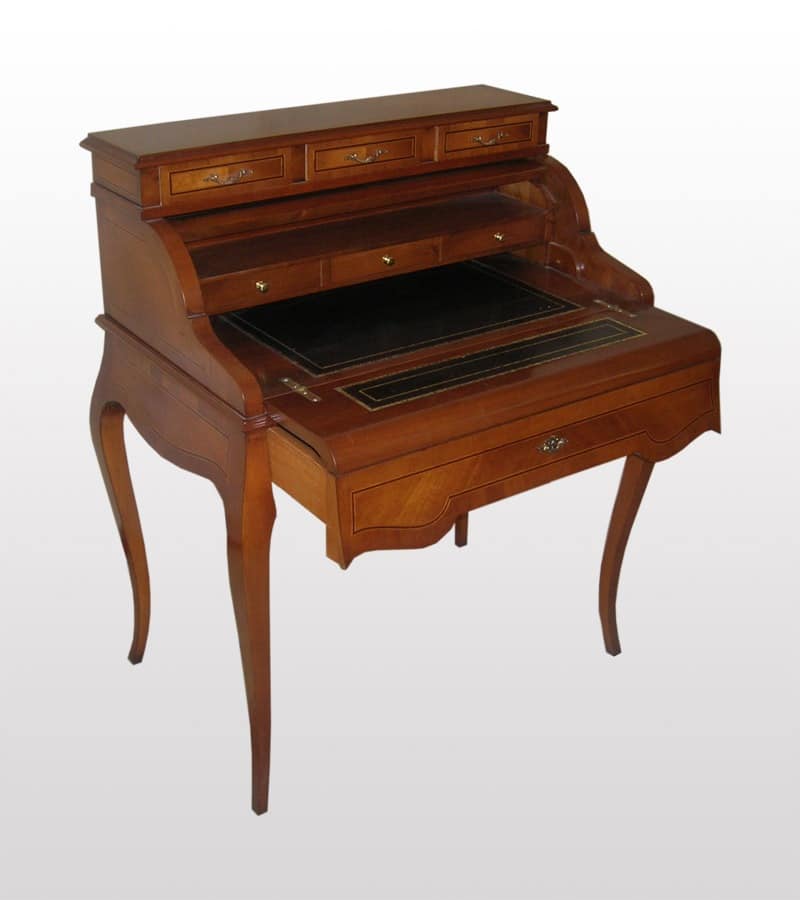 Accent writing desk with "roller" opening mechanism in walnut wood with maple inlays; writing desk with leather top with golden contour.