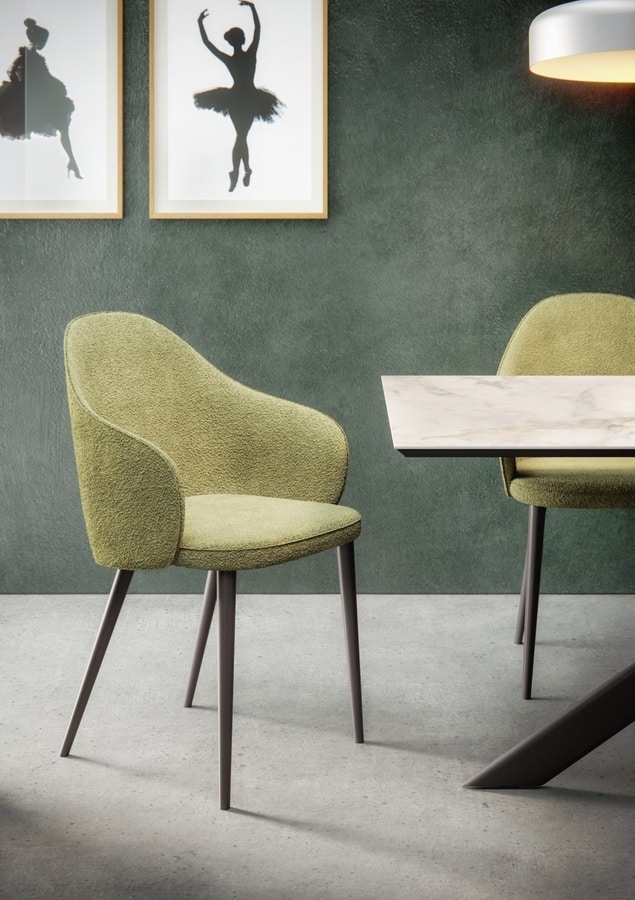 Armchair with steel structure, seat and back upholstered in fabric, available in various colors.