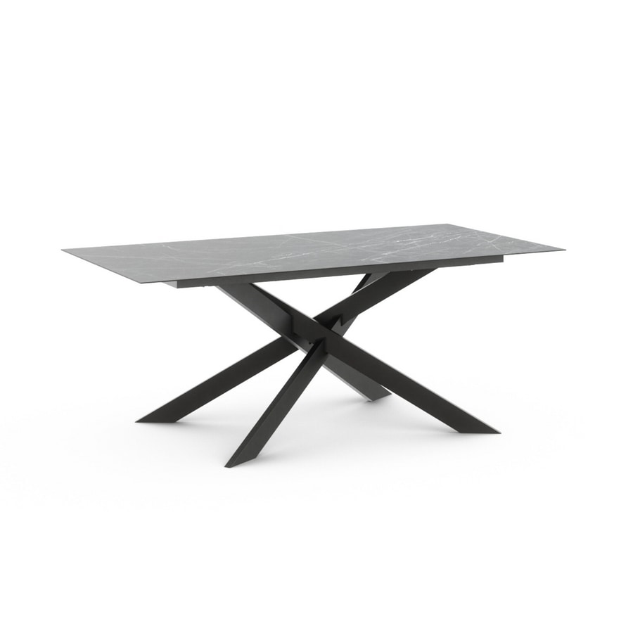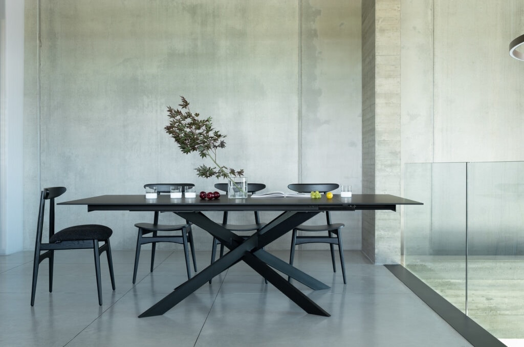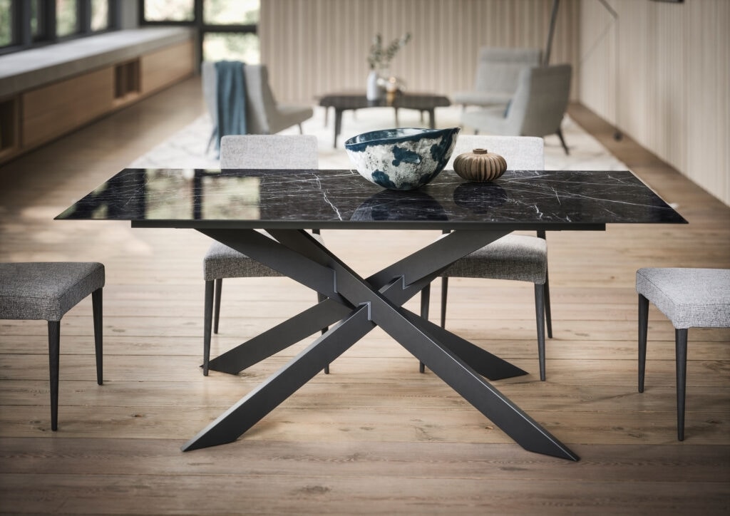 Request quote/price Similar productsThanks to the special extension mechanism of this extending table, the base is always at the centre of the table. Available with top in either wood, fenix, hpl or ceramic. Underframe made of four intertwining metal legs with a rectangular section.
