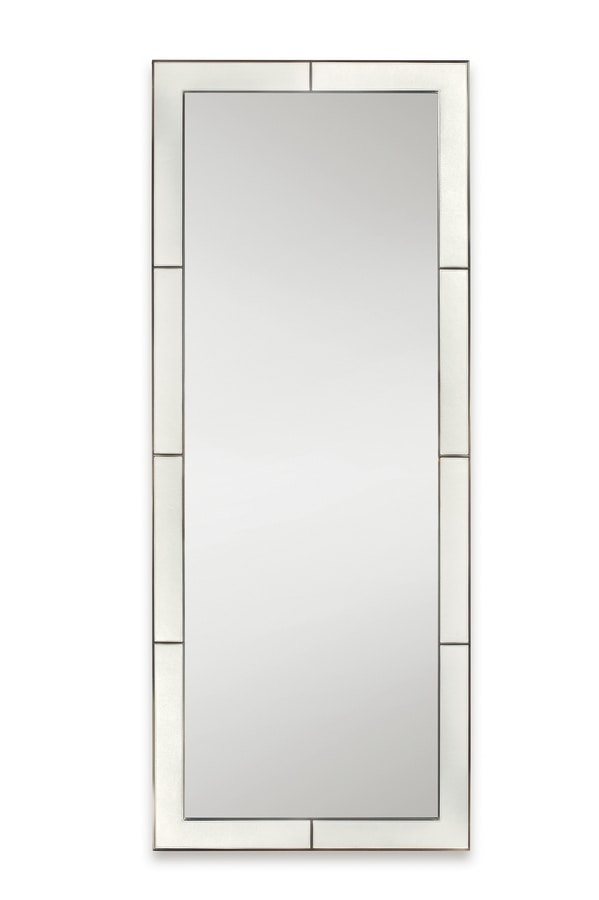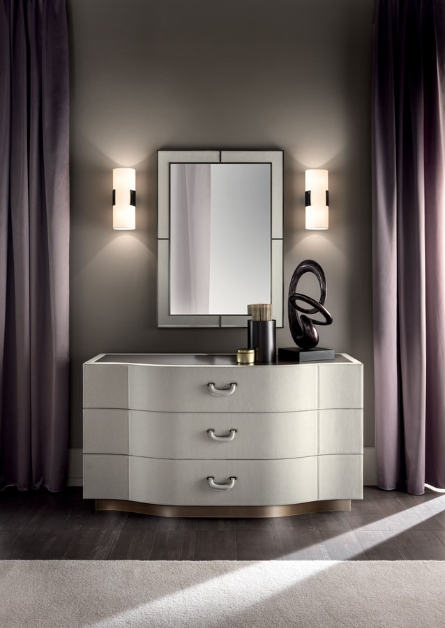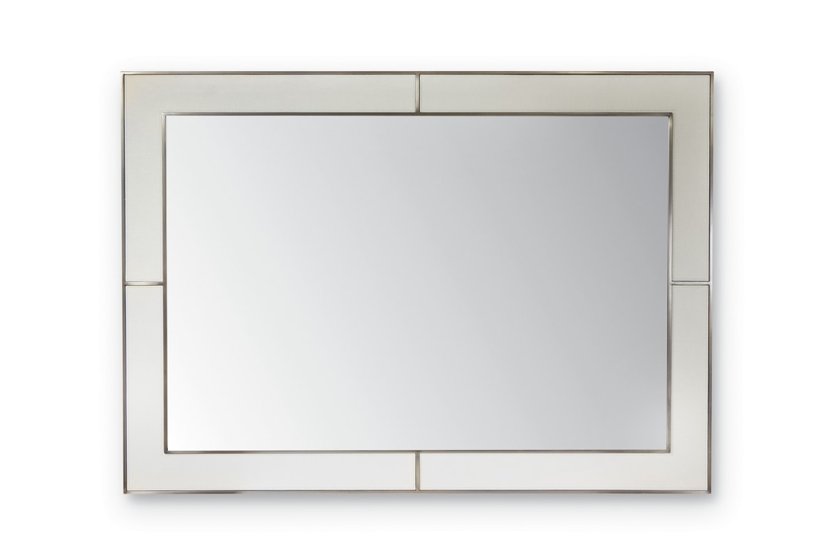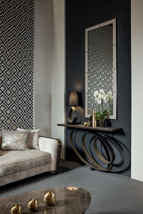 The mirror has a double-layer silver background. The frame is in full iron decorated by hand or with a bronze galvanic-bath finish and serves as a frame for the top-stitched inserts that are covered in leather, saffiano leather or in a leather provided by the customer. The Amelia mirror is available in two sizes and can also be mounted vertically or horizontally on the wall.