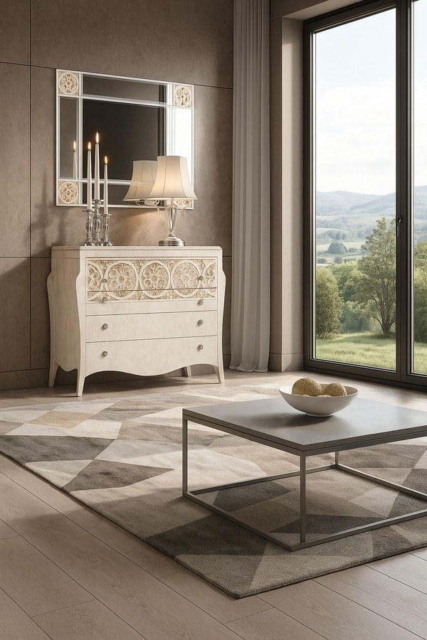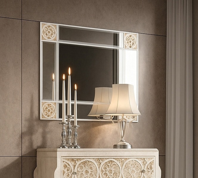 Request quote/price Similar productsThe Mirror 1638 perfectly matches the contemporary design of the Elegance collection, thanks to its clean lines and geometric embossed details, available in multiple decorative variants. Its surface features eco-friendly water-based lacquer finishes, customizable in a wide range of colors and shades to suit any interior. A versatile and refined furnishing element, Mirror 1638 can be combined with the Elegance bedroom set or used as a standalone piece to enhance modern entrances, living rooms, and bedrooms.