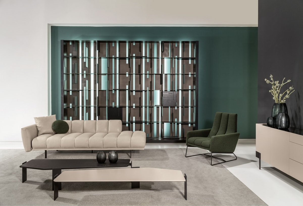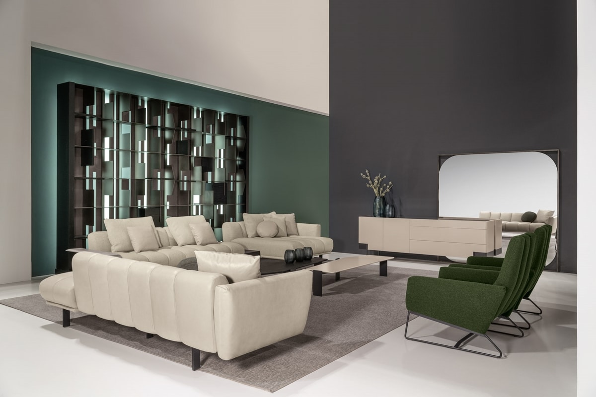Dormeuse system and modular sofa with characteristic side-by-side lozenge workmanship.