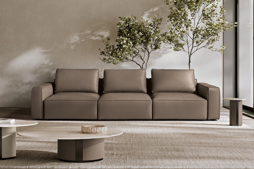Starring a leading role in the living area, the Raja four-seater modular sofa lends itself dynamically to a wide range of configurations, ready to satisfy all the activities of a daily life. Perfect to be placed in an open space in its double-sided version, it is a model that stands out for its defined and rigorous volumes, counter balanced by the soft removable backrests upholstered in fine goose feather. Available with removable fabric or upholstered leather, Raja can be further embellished with the insertion of a pouf with a Canaletto walnut shelf.