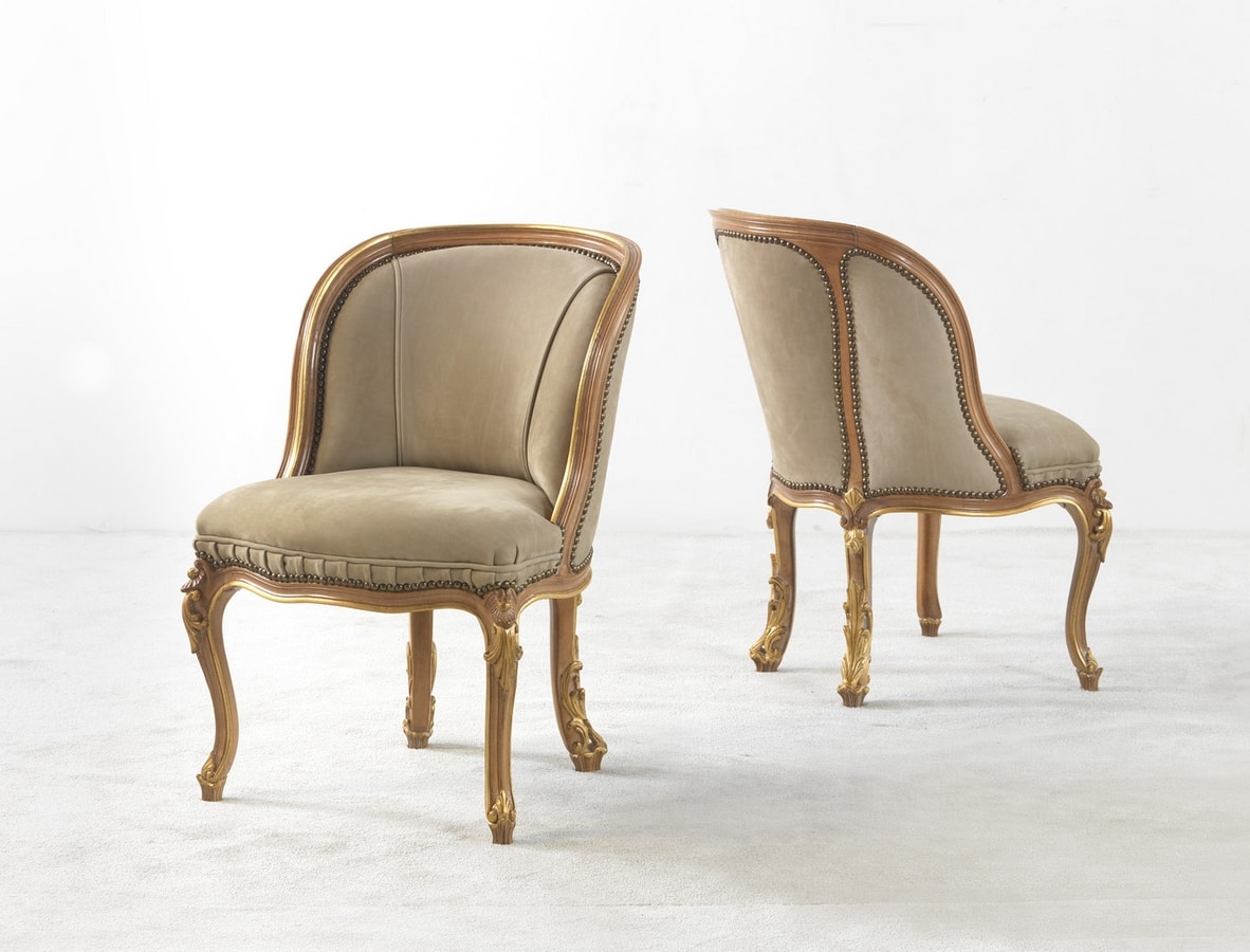 Chair with structure in natural decapè finished, with gold details. Leather upholstery.