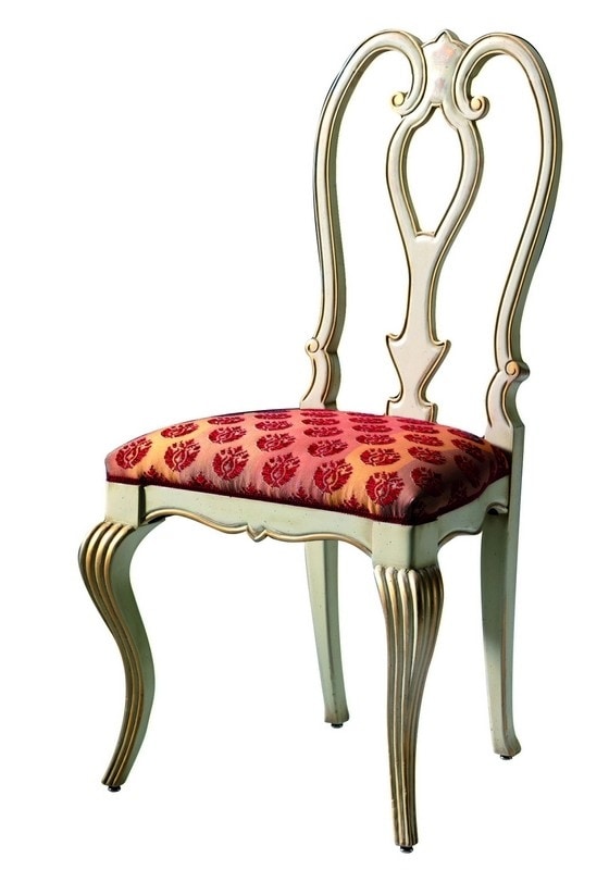 Padded chair with openwork backrest and shaped base with carved legs. In the photo, ivory (RAL1015) matt lacquered walnut structure with gold leaf details, no distressing.