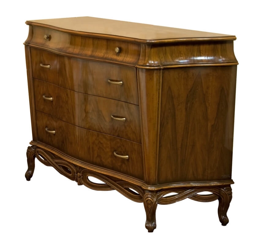 Shaped walnut chest of drawers, with band under the top and sides in crotch walnut, tapered front in walnut burl, divided into four drawers. Fully carved base with an intertwining design ending in cabriole feet.