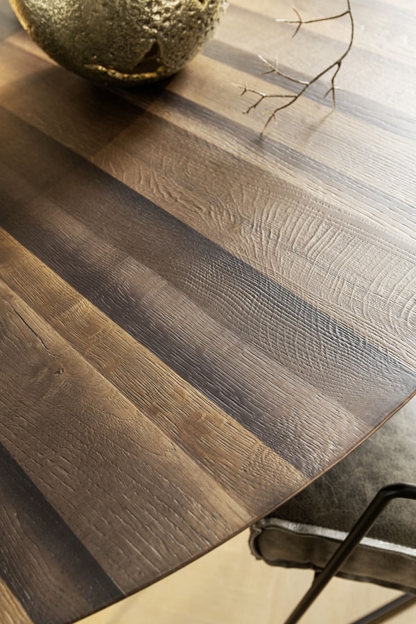 Tops in solid oak, 40 mm thick, brushed surface. Base with powder coated or oxidized steel base with acrylic finish. Legs in shaped solid oak.