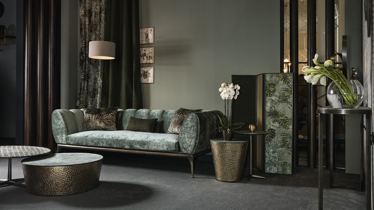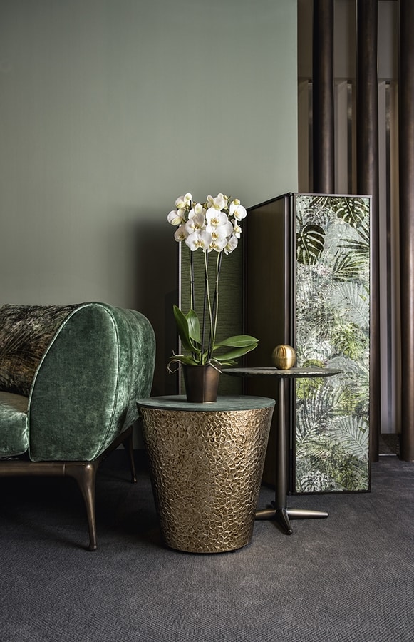 Conico is a contemporary coffee table, consisting of a single geometric element, and characterized by the use of contrasting materials: the base can be upholstered in leather or hand-decorated with original Cantori finishes, while the top is in ground or coated mirror.