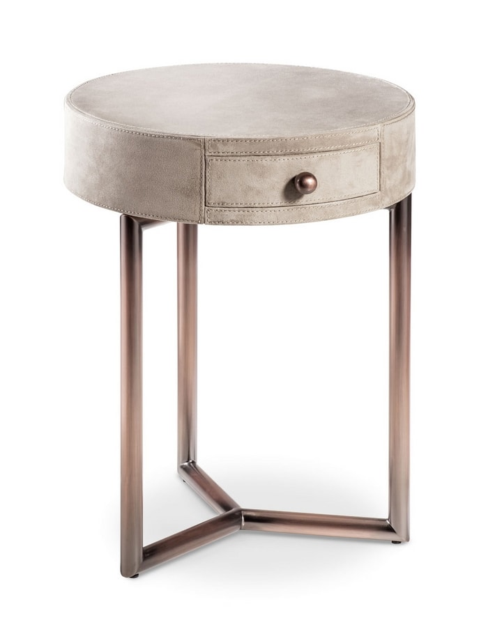 The Teo side table has a vintage style expressed by its metal structure. The top, with a drawer, can be covered in leather or eco-leather, or even decorated with any of the finishes available in the sample set.