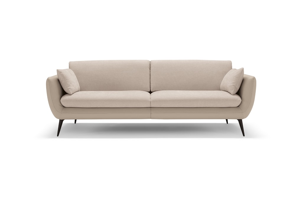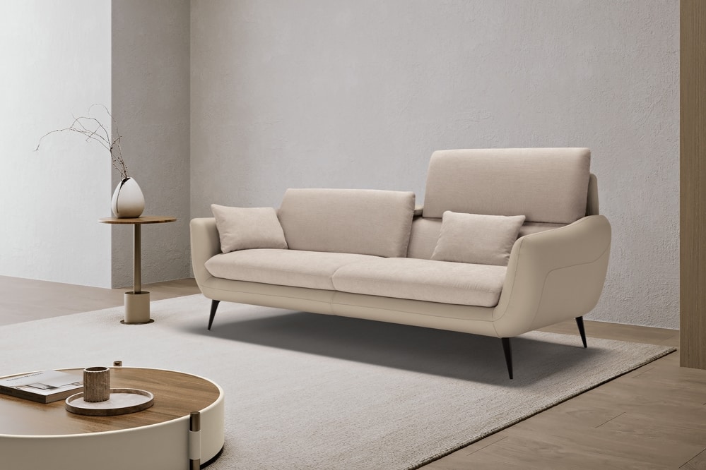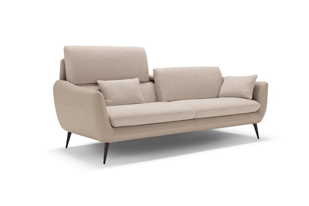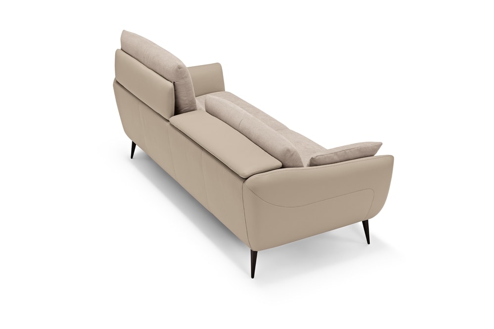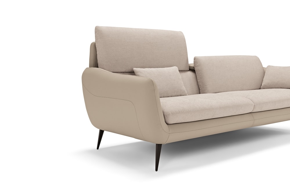 A synthesis of comfort and rigorous elegance, the large three-seater sofa Core is defined by a upholstered leather cover, inner padding parts covered in fabric of the same shade. Available in a wide selection of items to meet all space requirements, Core never loses sight of the relaxation: we have integrated a vertical translation movement into each seat to allow and increase the height of the backrest, which thus also becomes a headrest. We have also equipped it with soft, removable cushions that can be used as armrests or, if necessary, as lumbar support. To lift it off the ground, giving it an overall lightness, faceted feet in painted metal.