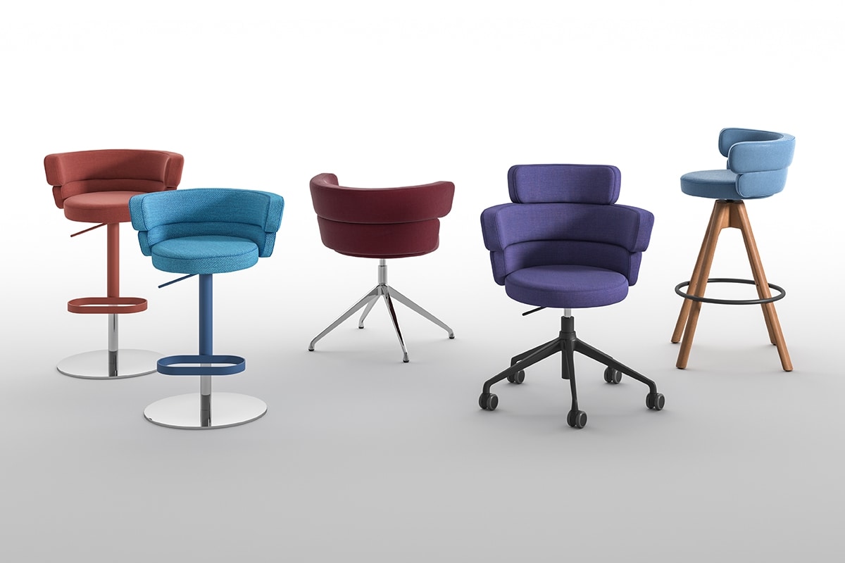 Dam is a collection of upholstered chairs featuring a backrest made of two joined soft, wraparound bands which, as well as providing comfortable support in the lumbar area, serve as armrests. The backrest and the round, generously padded seat are supported by various chrome-plated metal, polished or painted frames. The small armchair is available with or without rotating casters while the swivelling, adjustable-height stool is supplied with a satin-finish stainless steel frame and chrome-plated or painted footrest. This project, which combines aesthetics with functionality, is suited to all types of environments, from home interiors to public settings.