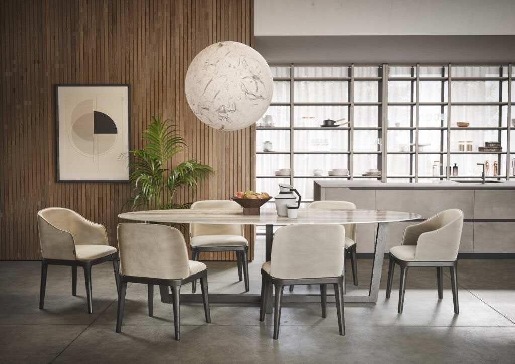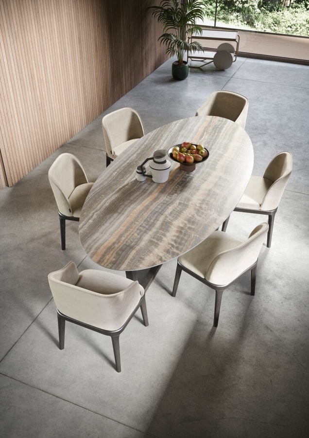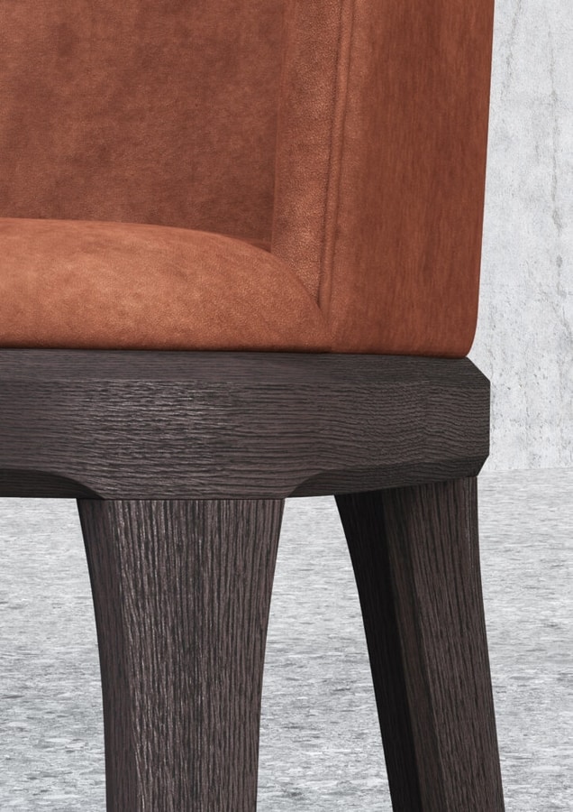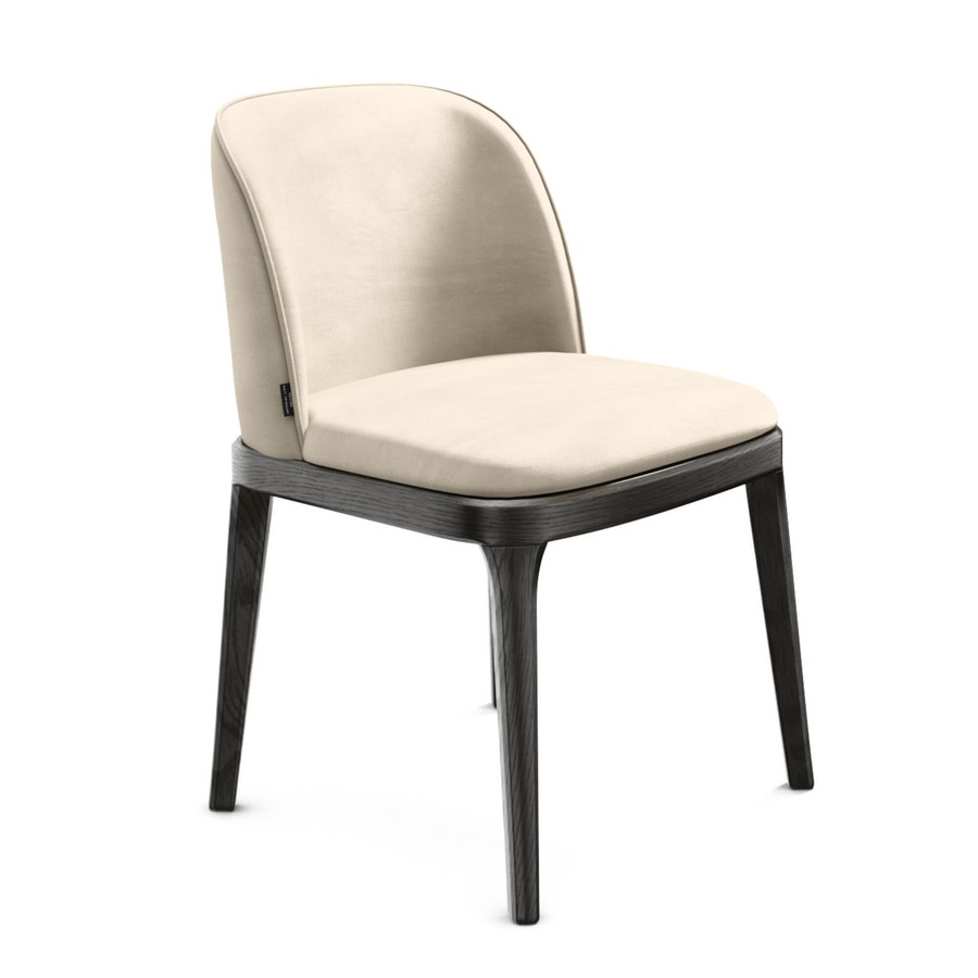 Request quote/price Similar productsChair featuring a frame in either oak or walnut. A wide range of coverings in fabric, leather or eco leather can be used for the seating – also with contrasting borders. With faceted legs. Available also in the “petite” version (oak structure only).