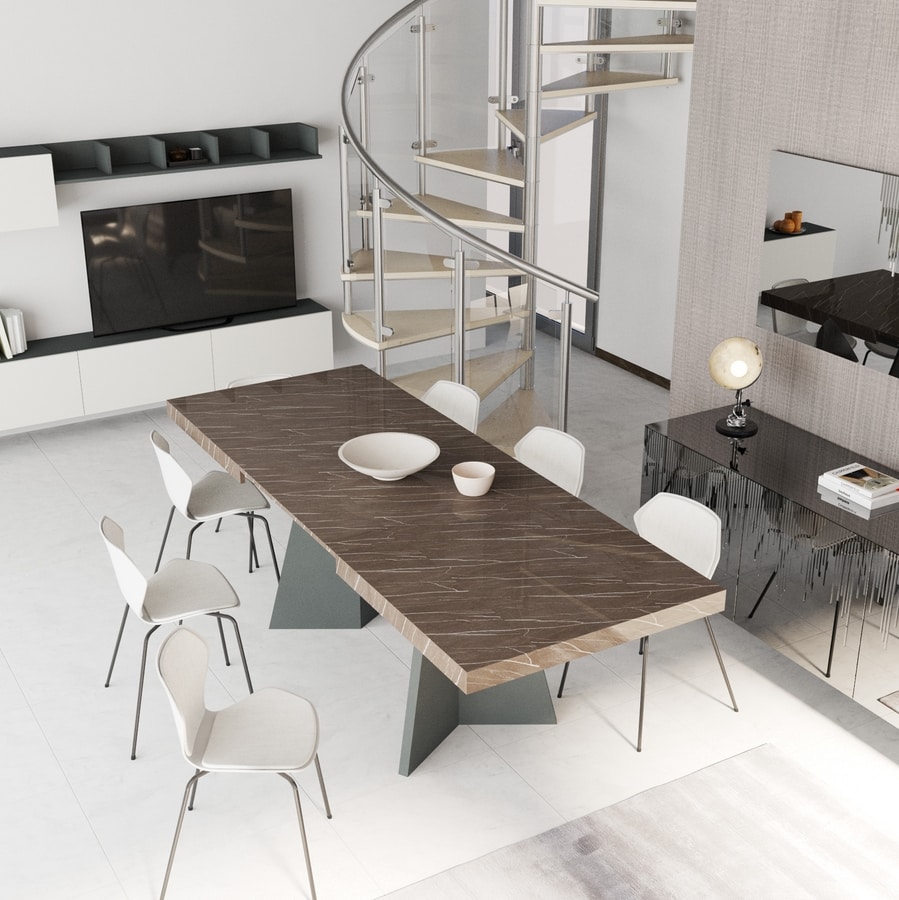 The portal base in painted metal, with its inclined uprights, sketches an architectural frame that supports with solidity without weighing down the form. The linear top, also available in Pulpis marble, enriches the composition with refined, tactile presence. A.2 brings proportion and character, introducing a clear, distinctive gesture into the dining space.