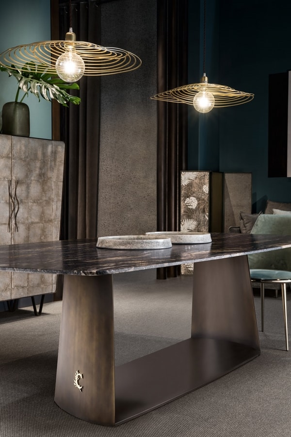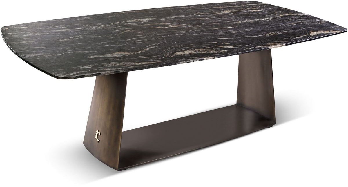 Table with metal base, rectangular marble top.