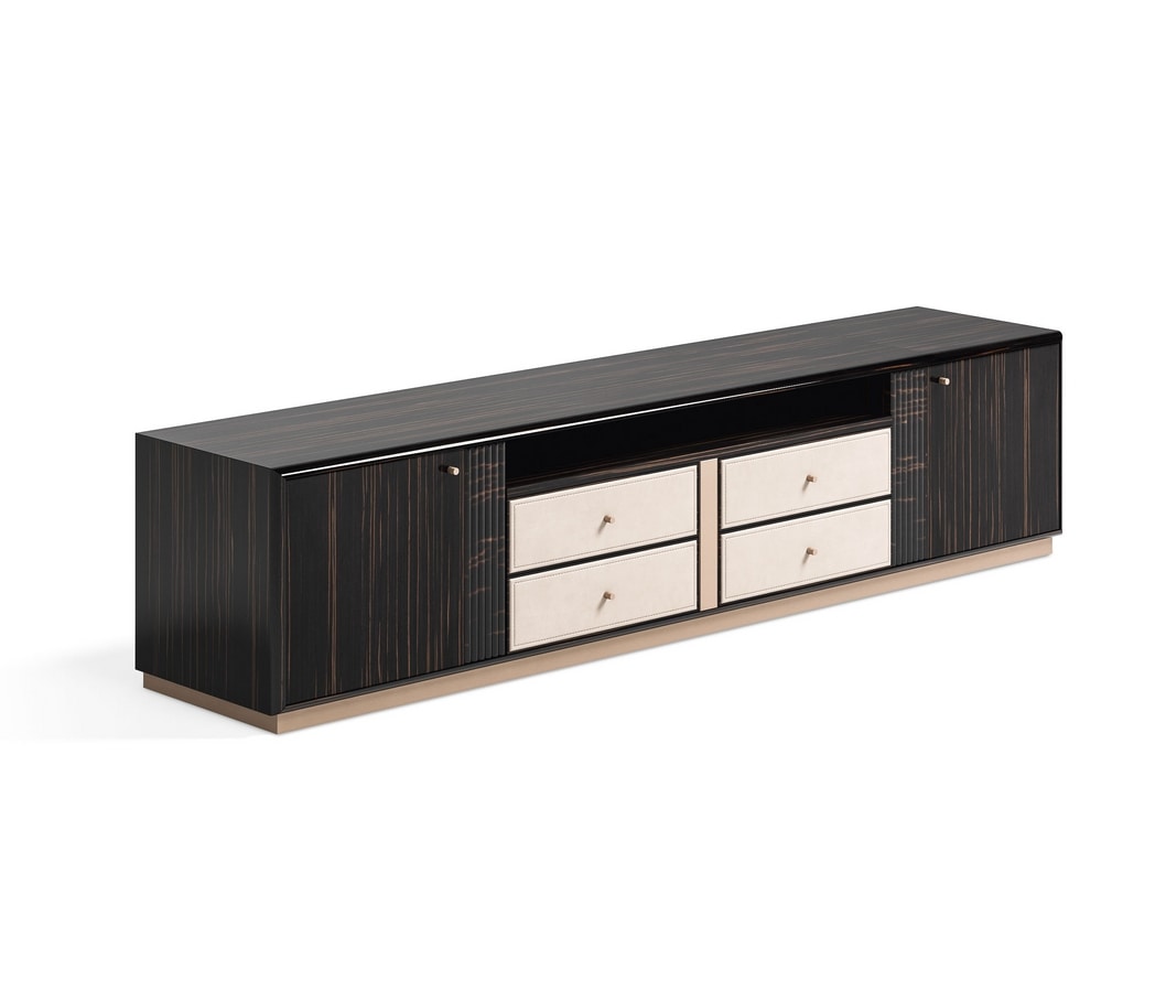 Drawers: wood with fronts covered in leather or fabric. Internal lacquered wood and coated in microfiber.