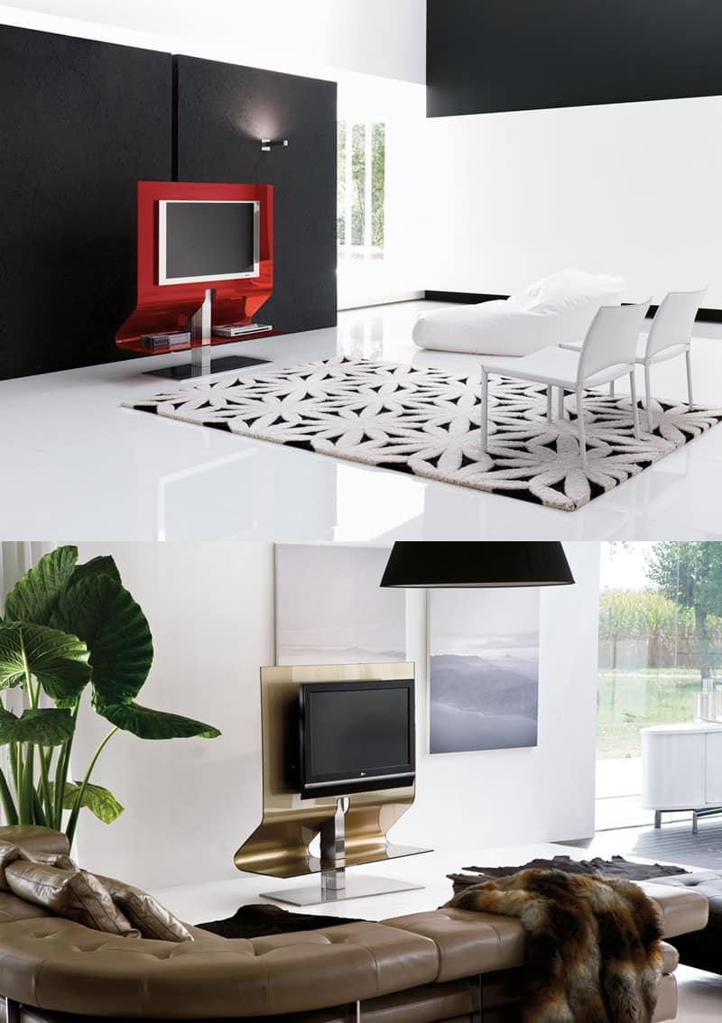 Steerable TV stand in curved glass suitable for dining room, living room, bedroom, showroom. Structure in curved glass; base in metal; support in satin stainless steel with disappearing chock for wiring.