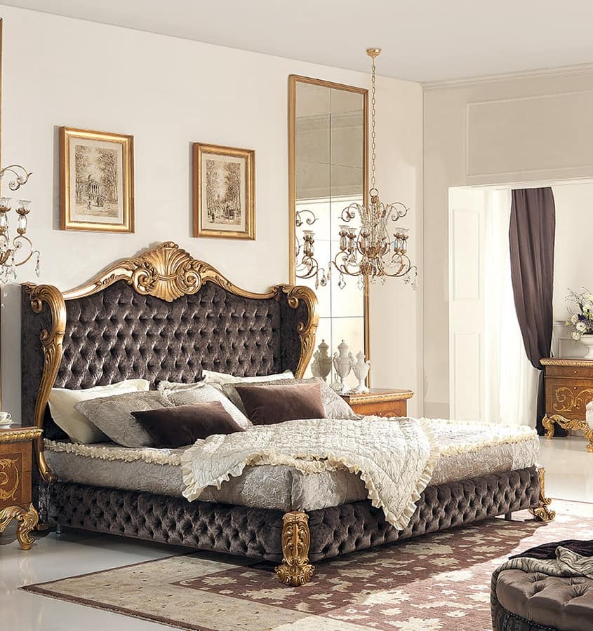 Classic style bed. Headboard with bed frame in hand carved wood, completed with a prominent padding. Finish scratched red gold leaf.