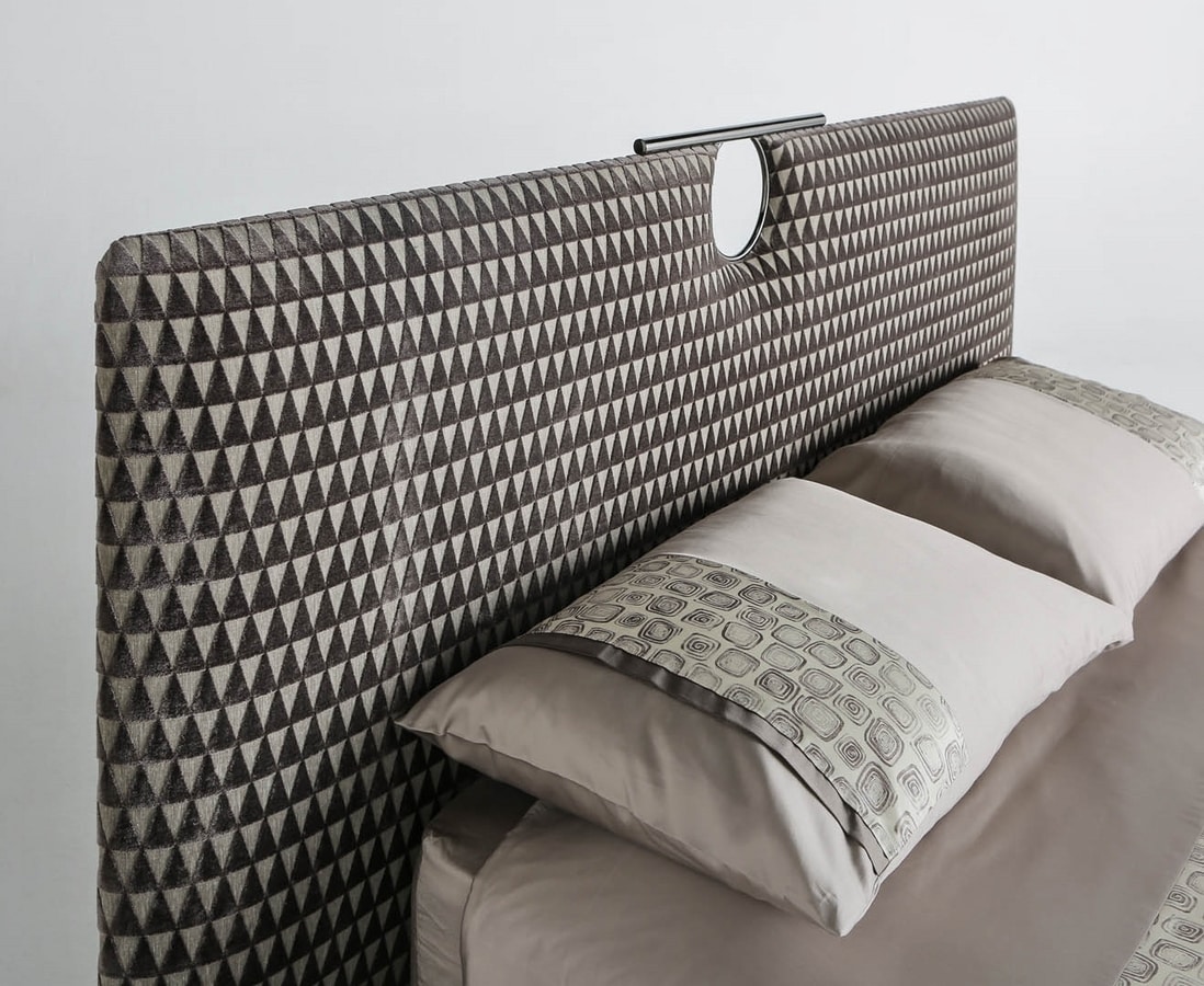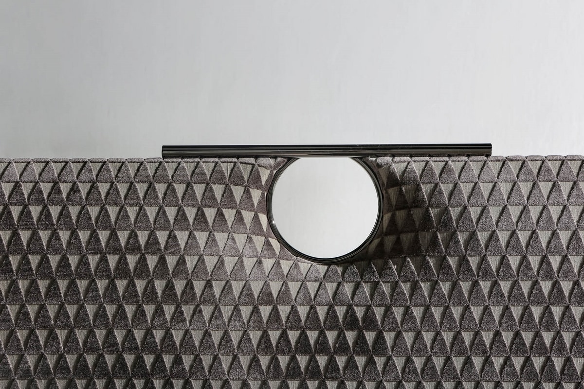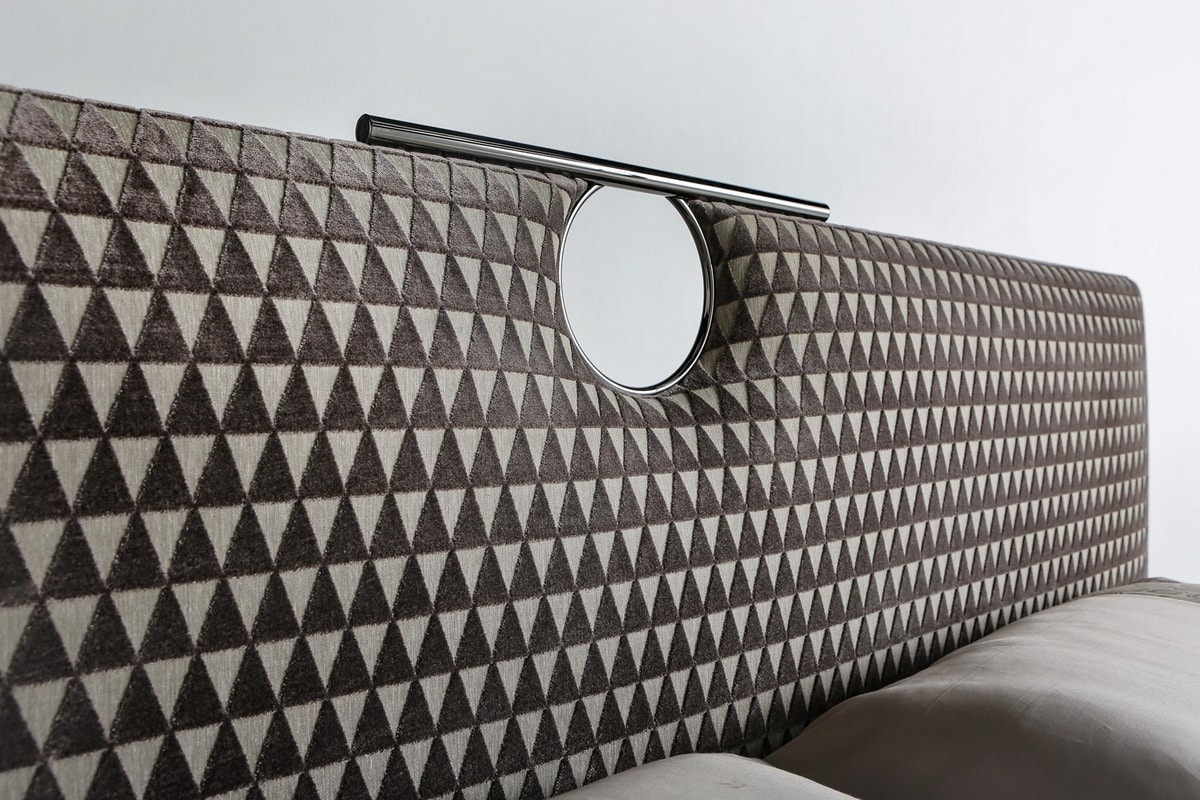 The Bay padded double bed, embellished by the metal detail set in the shaped headboard.