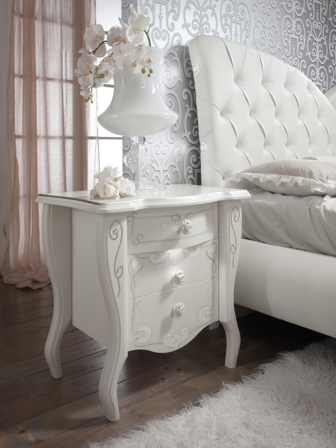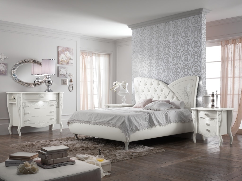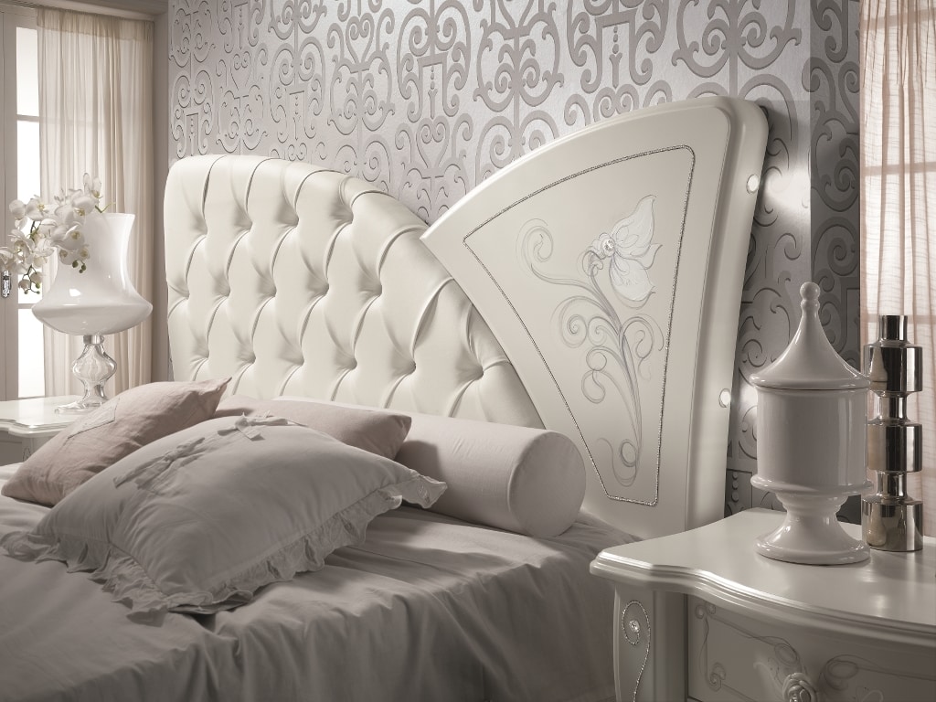 Bed mod. Chloč matt white lacquered ashlar with handmade decoration. Padded buttoned hole in white eco-leather with swarosky inserts. Led lights on the outside. High padded bed frame with container and net included.