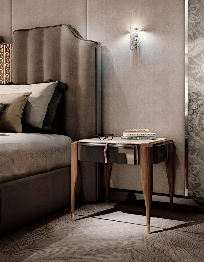 In the bedroom continues, in style and form, what has already been expressed for the living area. The bed is covered in nubuck and embellished with the theme of the inlays made with polychrome woods. All the elements that make up the sleeping area give back the singularity of the Decò style of overseas, revisited in the light of the contemporary.
