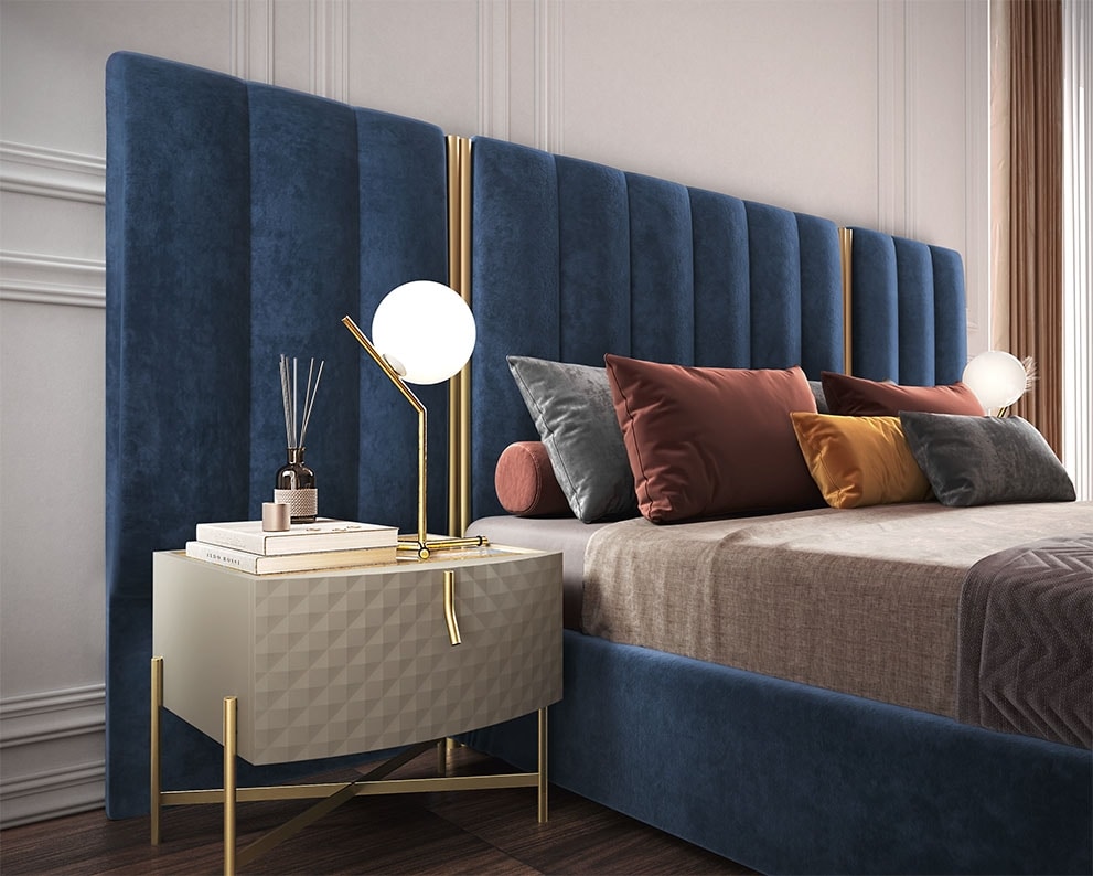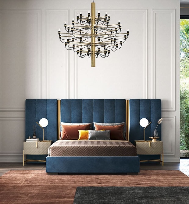 Modern Plus model bed with large headboard covered in light or dark blue Nabucco fabric. Embellished with golden details.