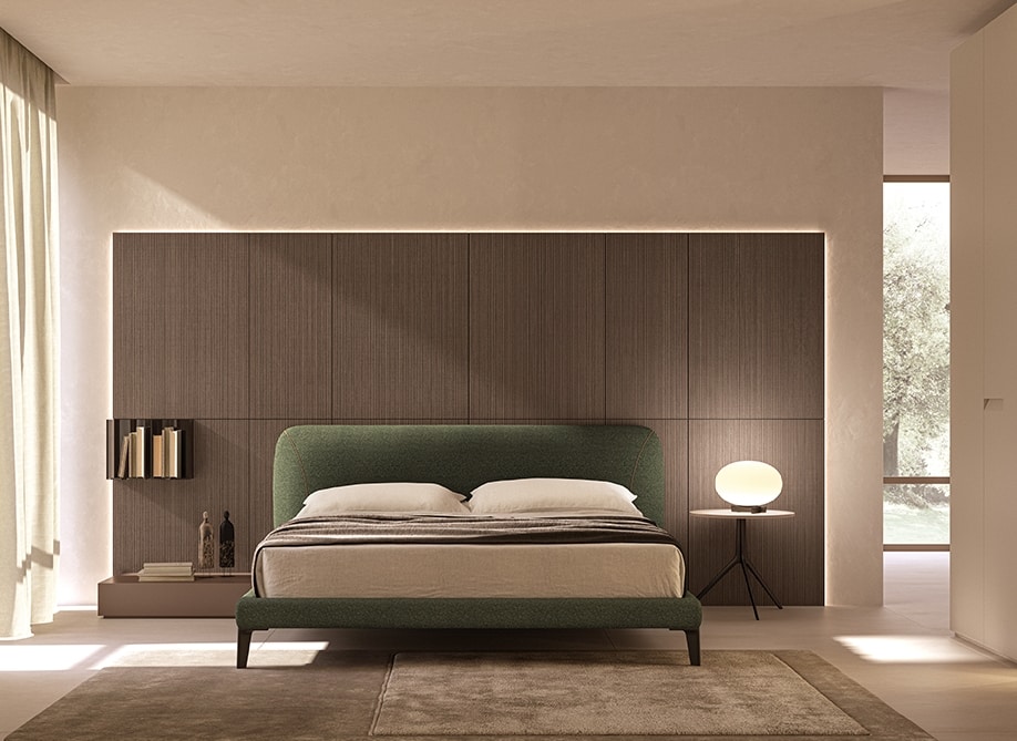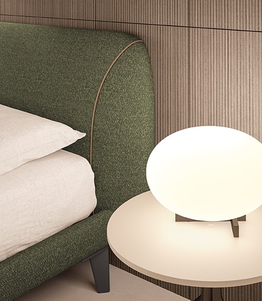 The Riviera bed, combined with the Boiserie and the Jimmy coffee table and the floor bench, give life to a refined and eclectic composition.