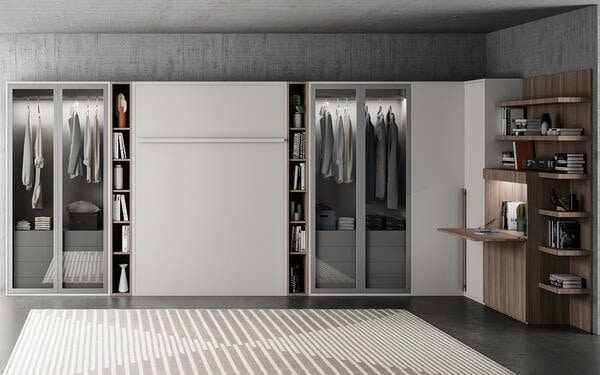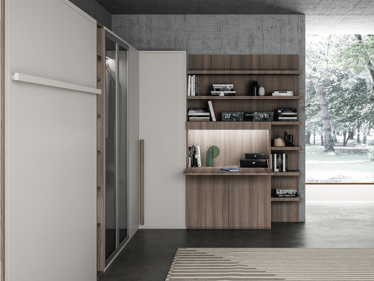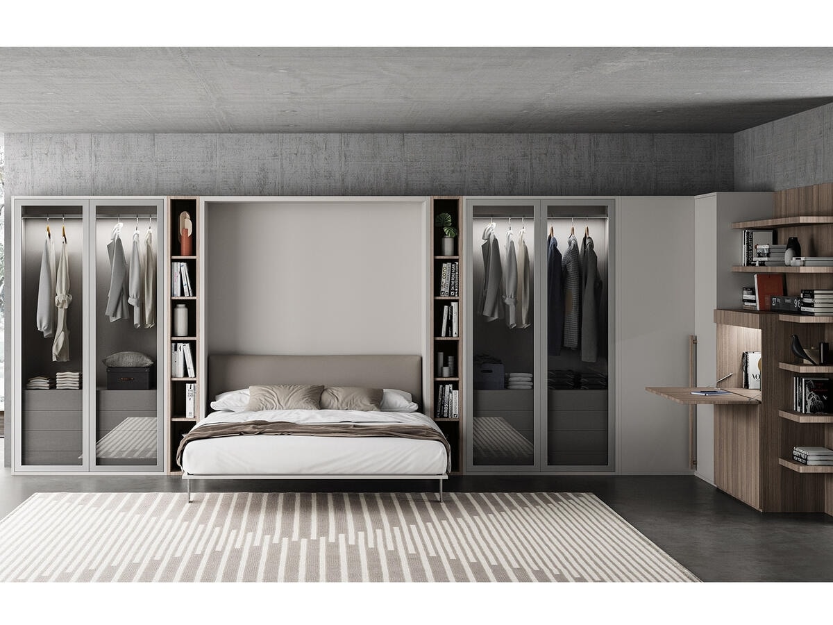 Composition with retractable bed, dressing room and desk.