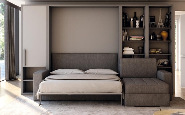 Modular cabinet with folding bed with sofa with integrated chaise longue. Space-saving solution customizable in finishes.